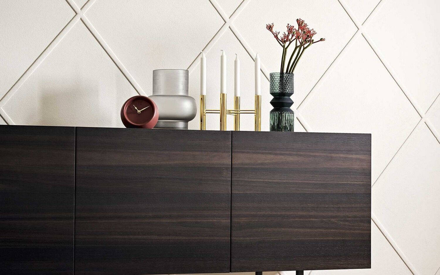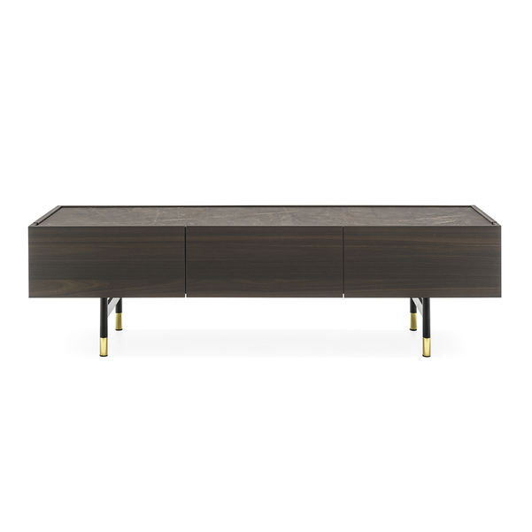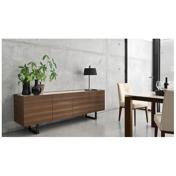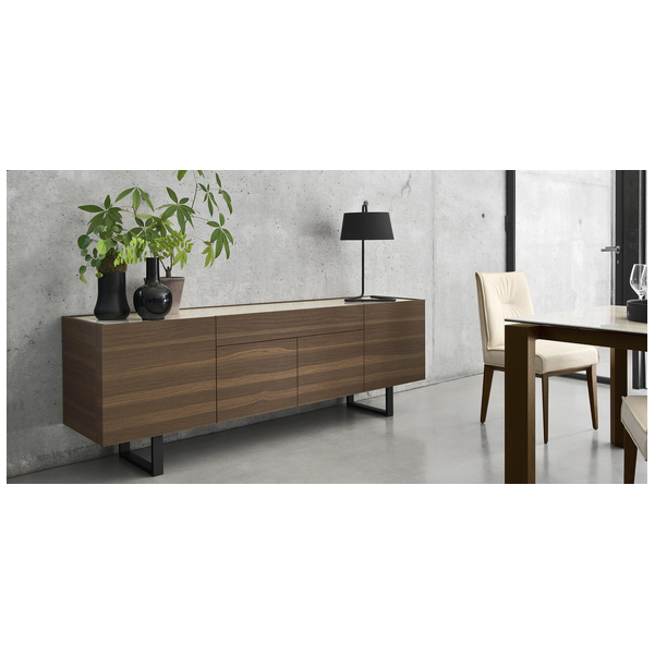 Horizon z 2 drzwiami bocznymi i 3 środkowymi szufladami, konstrukcja drewniana. Centralne szuflady bez uchwytów są wyposażone w system otwierania push-pull. Wszystkie przedziały są wyposażone w półkę z przezroczystego hartowanego szkła. Horizon wzbogacony jest o szklaną lub ceramiczną górną półkę oraz elegancką metalową podstawę o prostokątnym przekroju. Horizon to duża szafka do przechowywania, która idealnie nadaje się do przestronnych i wyrafinowanych jadalni, salonów. Odkryj wszystkie szczegóły!