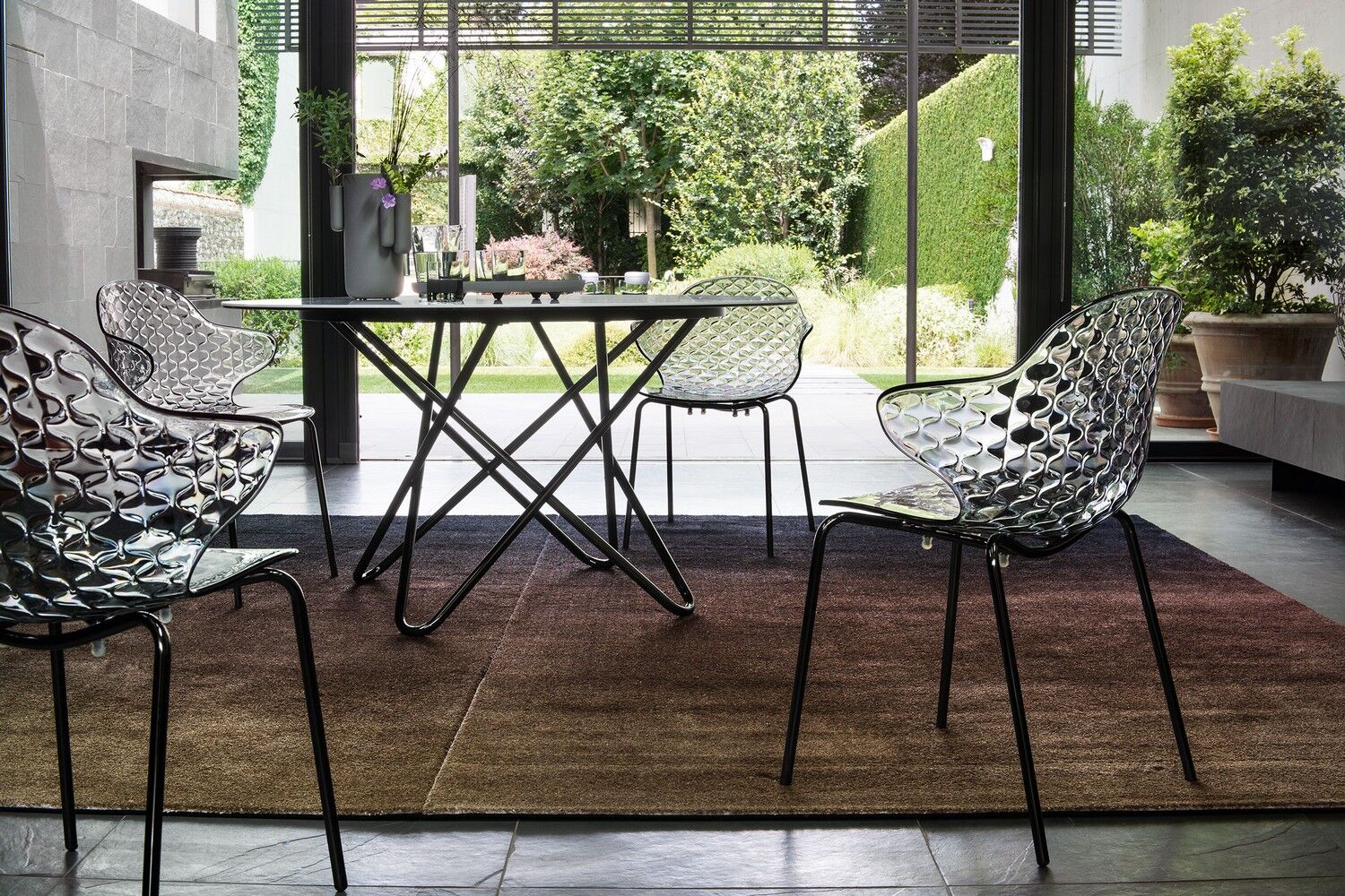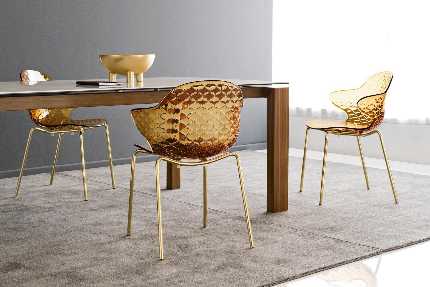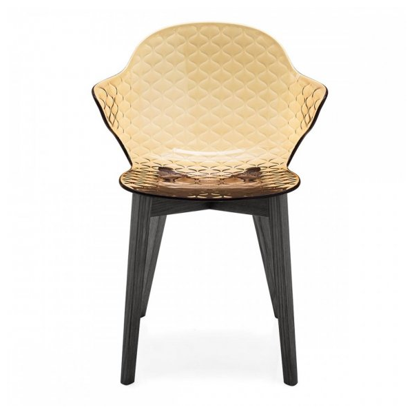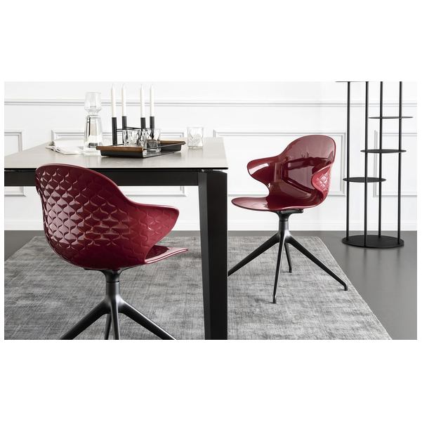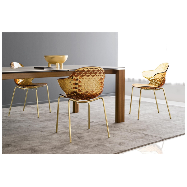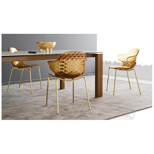 Kreatywny duch, skrzyżowanie formy i funkcji, wyróżnia krzesło Saint Tropez, które szczyci się dbałością o szczegóły i wyrafinowanym designem z oparciem z efektem pikowania. Powłoka z poliwęglanu jest wykonana w szeregu przezroczystych i nieprzezroczystych odcieni i jest zamontowana na czteronożnej metalowej podstawie.