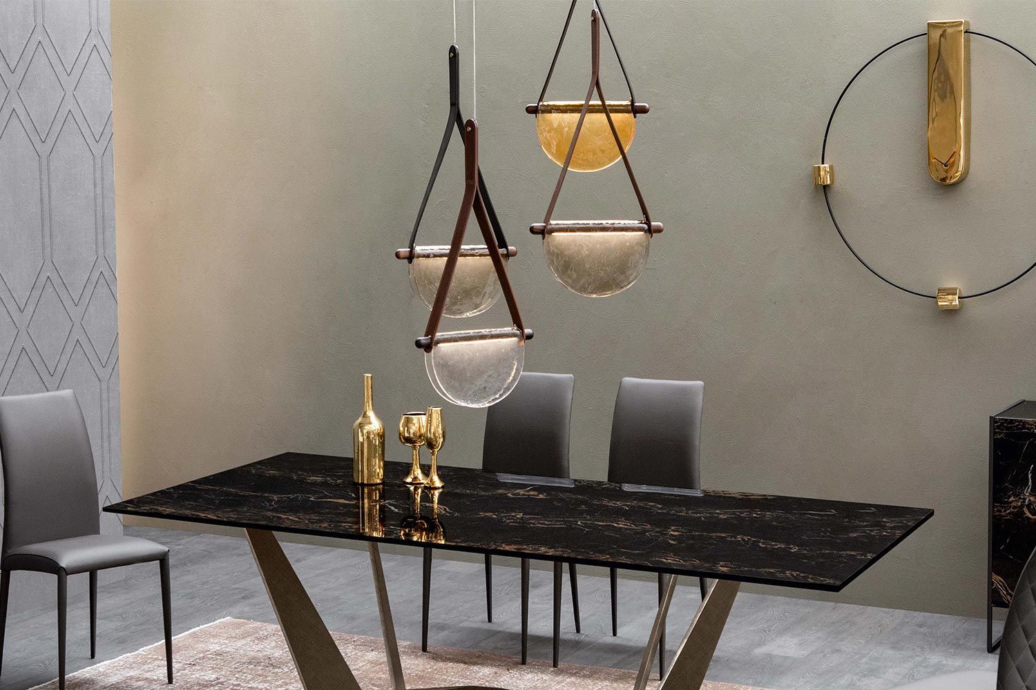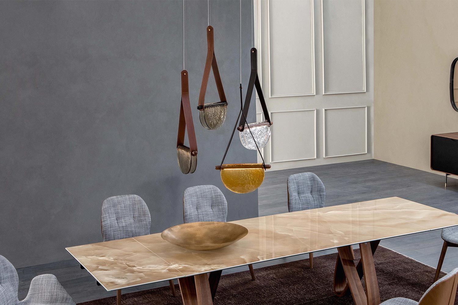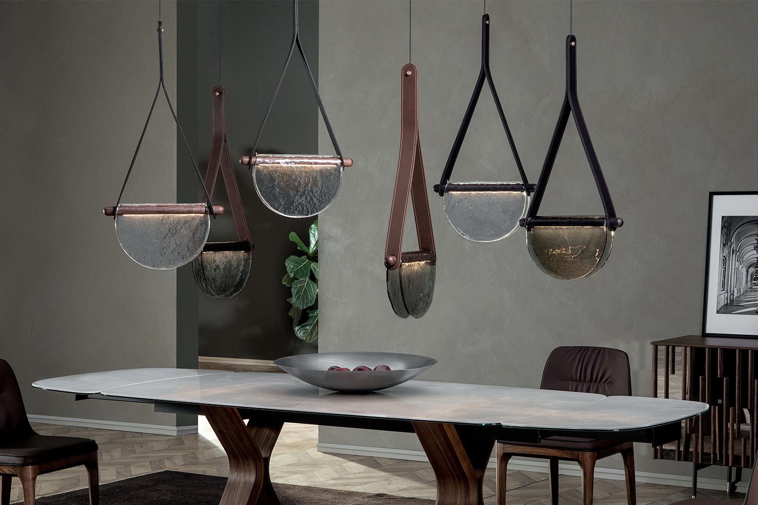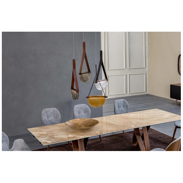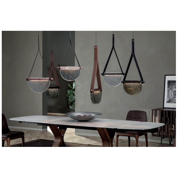 Lampa wisząca Dali to nie tylko doskonały sposób na oświetlenie pomieszczenia, ale także wspaniała opcja dekoracyjna. Zestawienie półkolistego szklanego dyfuzora ze skórzanym paskiem sprawia, że światło jest pięknym ogniskiem. Idealna do przedpokoju lub nad stołem, Dali oferuje nastrojowe oświetlenie, które odpowiednio tworzy nastrój. Umieść lampę wiszącą samodzielnie lub w oszałamiających grupach, aby uzyskać wszechstronne efekty wizualne. To część luksusowej kolekcji Dali, która wygląda niesamowicie w kompozycji. Dostępne są różne szklane wykończenia, pasek jest wyposażony w różne opcje skórzane. Wyjątkowa i przyciągająca wzrok lampa stołowa Dali marki Tonin Casa to niesamowita opcja dekoracyjna dla nowoczesnego domu. Jedyna w swoim rodzaju konstrukcja dodaje współczesnego uroku i zawiera dwustronny półkolisty dyfuzor. Różne kształty, kolory i materiały wyróżniają się na tle siebie, aby natychmiast uwydatnić styl pomieszczenia. Dzięki miękkiemu, skupionemu oświetleniu lampa idealnie nadaje się na biurko lub stolik nocny.