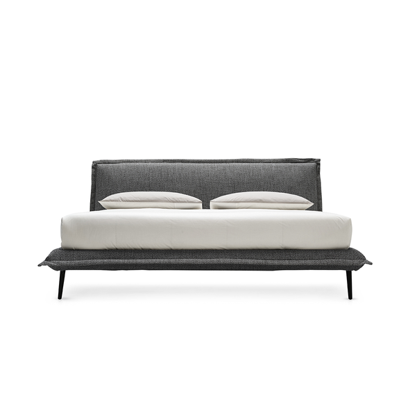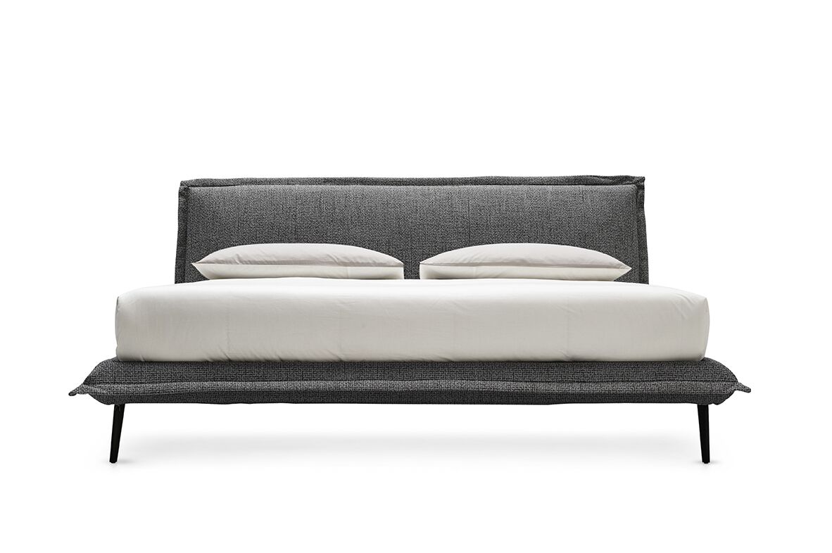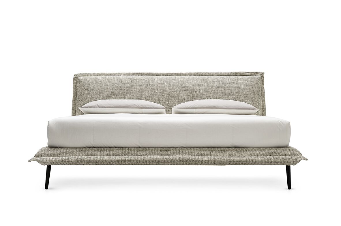 Fluff wyróżnia się trzeźwością i liniową prostotą. Objęte lekką ramą o odpowiednich proporcjach i połączone z zagłówkiem, tworząc jeden korpus połączony niewidocznymi szwami. Materac wydaje się zawieszony w powietrzu, chociaż spoczywa na lekkiej, ale solidnej konstrukcji osadzonej na smukłych metalowych nóżkach. Brzegi całego łóżka zostały obszyte detalem z tkaniny, który podkreśla doskonałą tekstylność produktu.