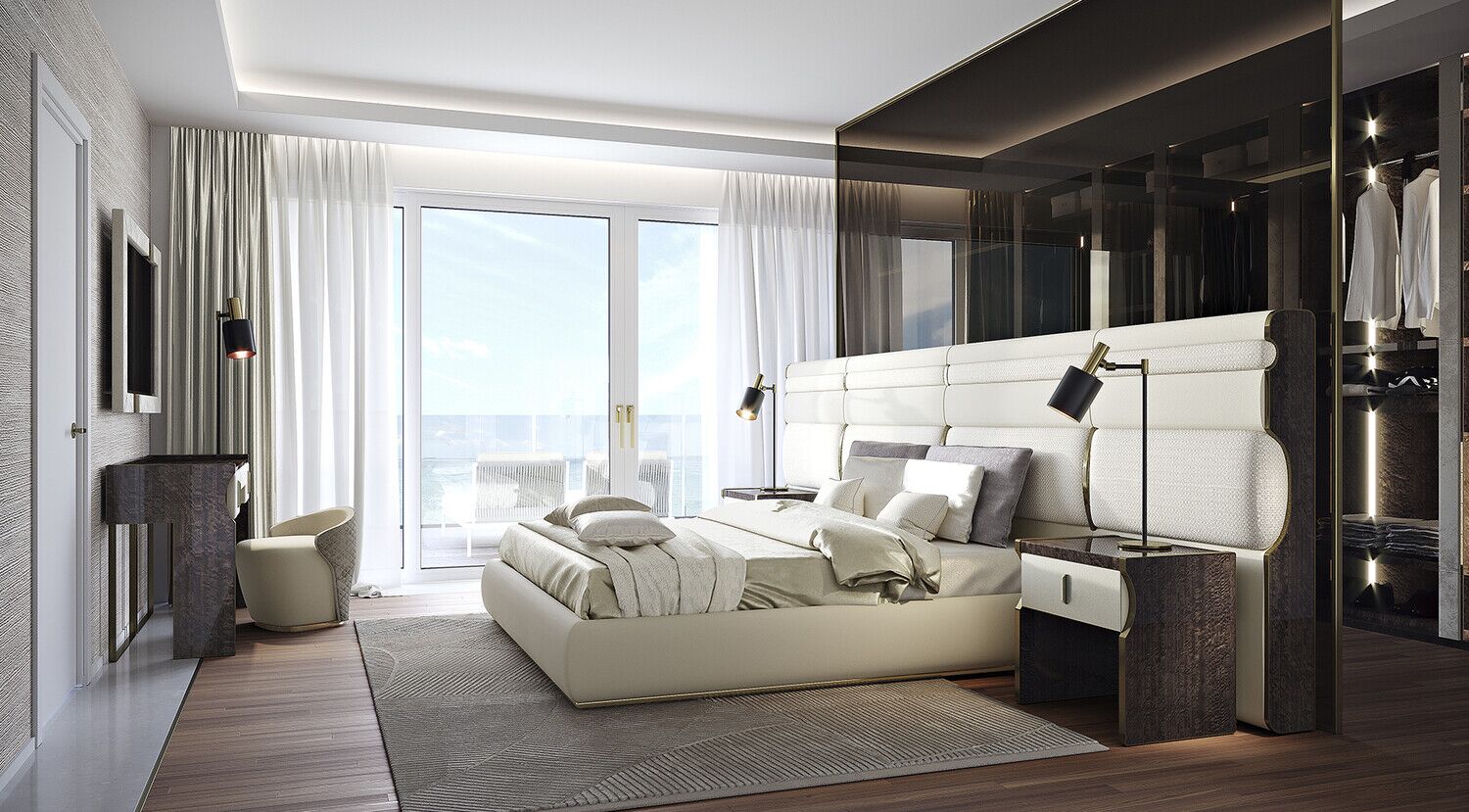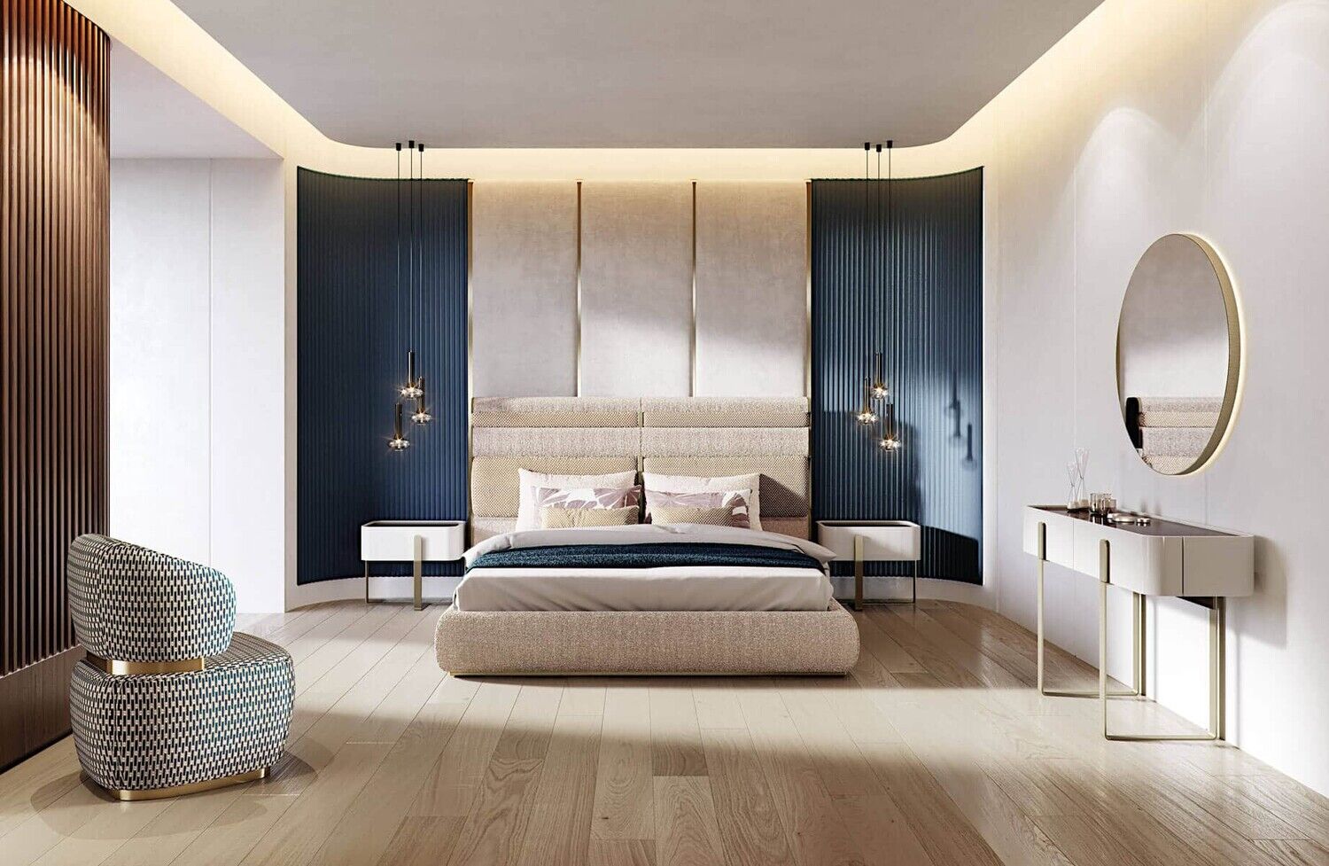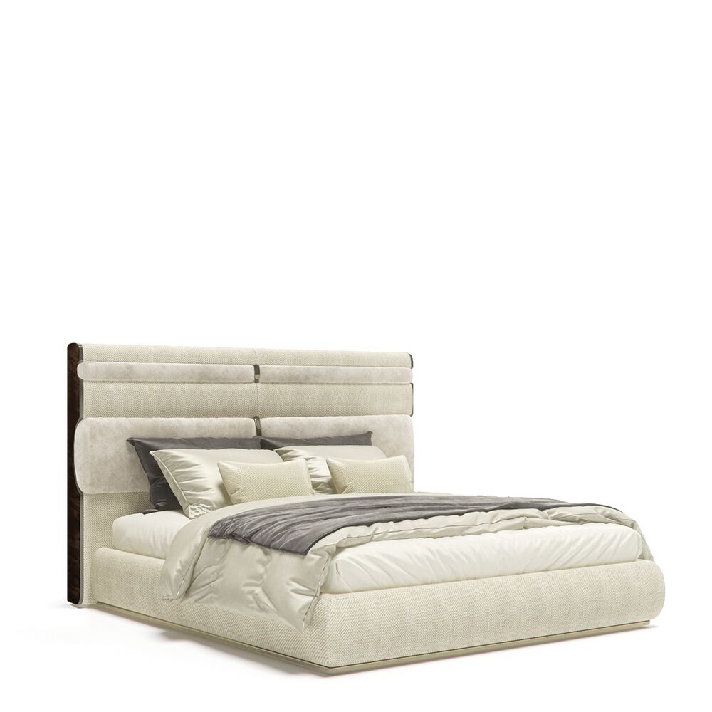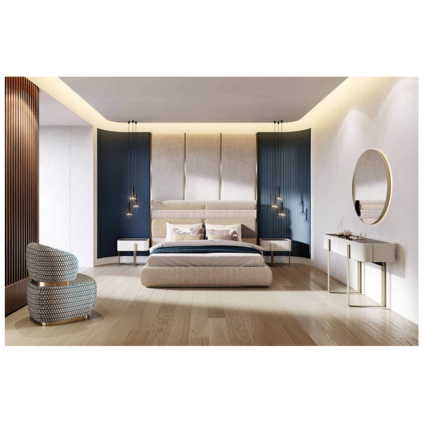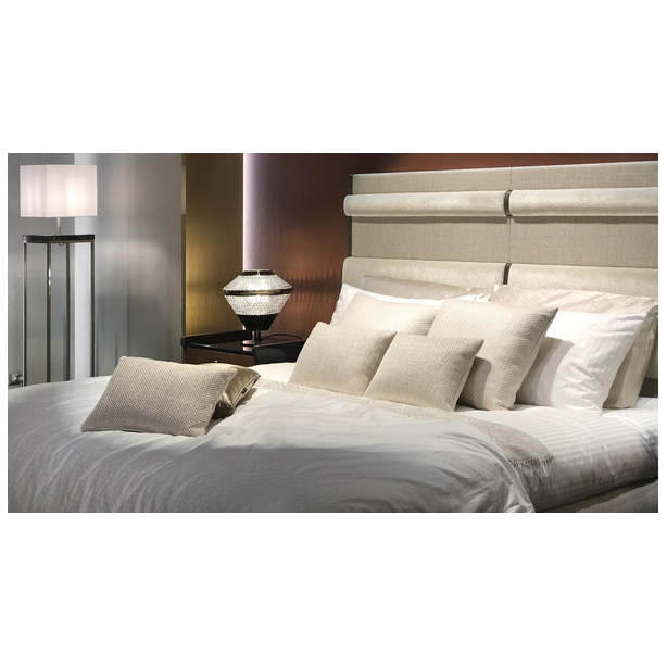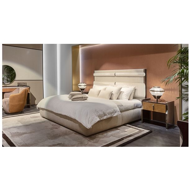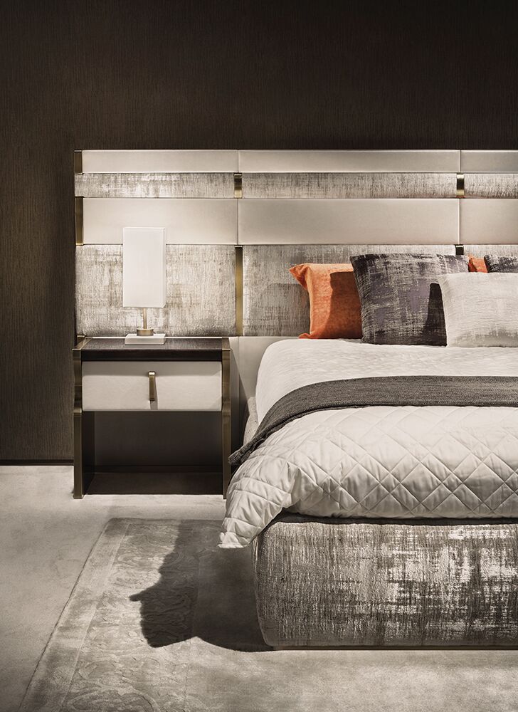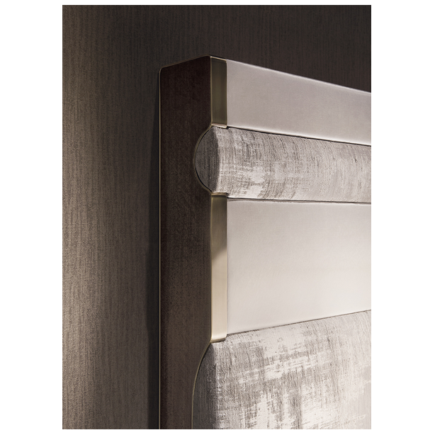 Trilogy to system, który w unikalny i wyrafinowany sposób wyposaża miejsce odpoczynku. Szereg paneli podzielonych metalowym profilem łączy się, tworząc zagłówek, który można dostosować z różnych tkanin i skór. Drewniana rama. Nieodkształcalna pianka poliuretanowa o różnej gęstości.