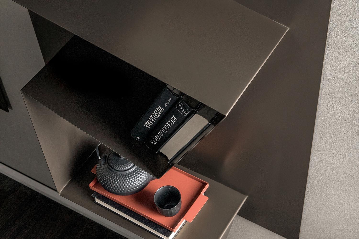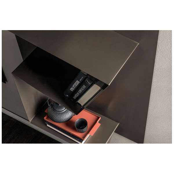 Regał Nota może służyć jako sposób na wyeksponowanie osobistej biblioteki, rzeźbiarskie dzieło sztuki, które wyróżnia się stylem w nowoczesnym domu. Inspirowana geometrią struktura jest pełna przyciągających wzrok krzywizn i kątów, dzięki czemu jest to jedyny w swoim rodzaju produkt. Niektóre powierzchnie są równe, podczas gdy inne są lekko pochylone, aby uczynić z tego ostry punkt centralny w salonie lub biurze. Aby uzyskać fajną funkcję, regał daje złudzenie, że balansuje całą konstrukcją na małej podstawie, ale jest bezpiecznie przymocowany do ściany. Metalowa konstrukcja jest dostępna w szeregu matowych wykończeń.