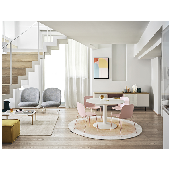 Balance to stały okrągły stół o prostym, ale kultowym profilu, którego wdzięczna linia łączy trzy elementy: wypukłą podstawę, środkową kolumnę i okrągły blat. Okrągły blat spoczywa na powlekanym metalowym cokole kolumny. Pomimo niewielkiej powierzchni styku między kolumną nośną a wybrzuszoną podstawą, stół jest wyjątkowo stabilny dzięki mocno obciążonej metalowej podstawie. Smukły, elegancki i prosty Balance spełnia wszelkie praktyczne i estetyczne potrzeby i może być dostosowany do różnych kontekstów, w tym do wnętrz domowych i przestrzeni publicznych lub komercyjnych.