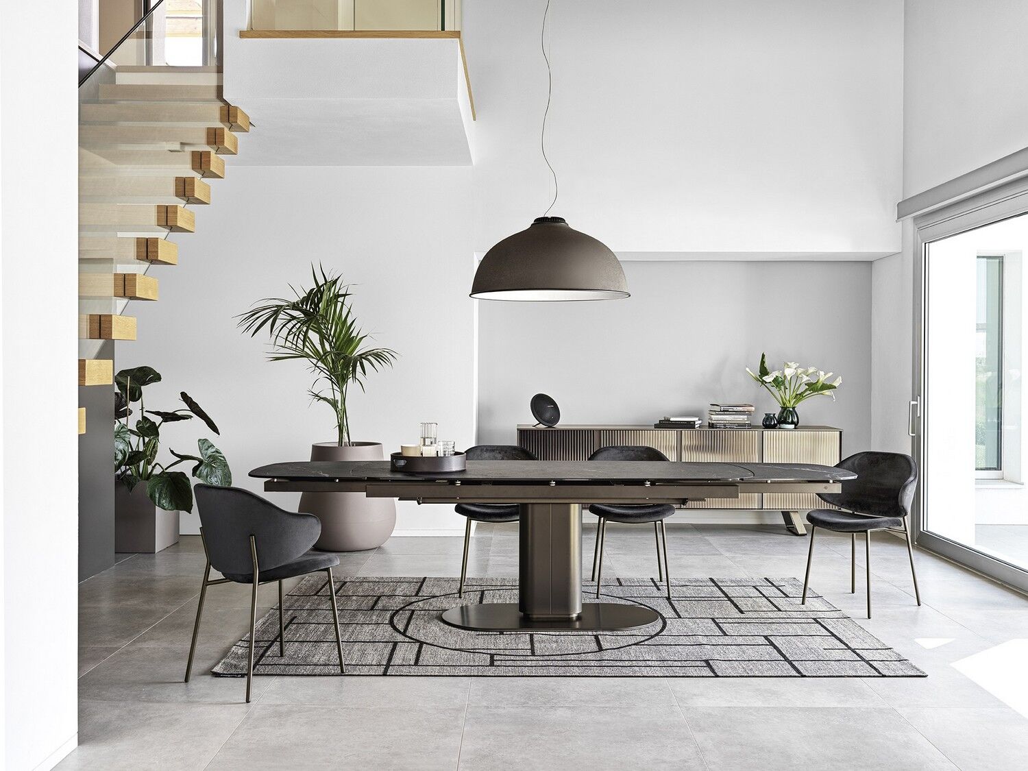 Cameo stół o ostro zarysowanej owalnej sylwetce, która nadaje mu silną osobowość i nie tylko zapewnia stabilność, ale pozwala maksymalnie wykorzystać przestrzeń pod blatem. Wykonana z powlekanego metalu kolumna centralna obsługuje różne typy blatów; połączenie metalu i drewna jest niezmiennie wyrafinowane, podczas gdy mieszanka metalu i ceramiki z efektem marmuru tworzy kontrast między zimnymi i ciepłymi materiałami i jest niesamowicie nowoczesna.