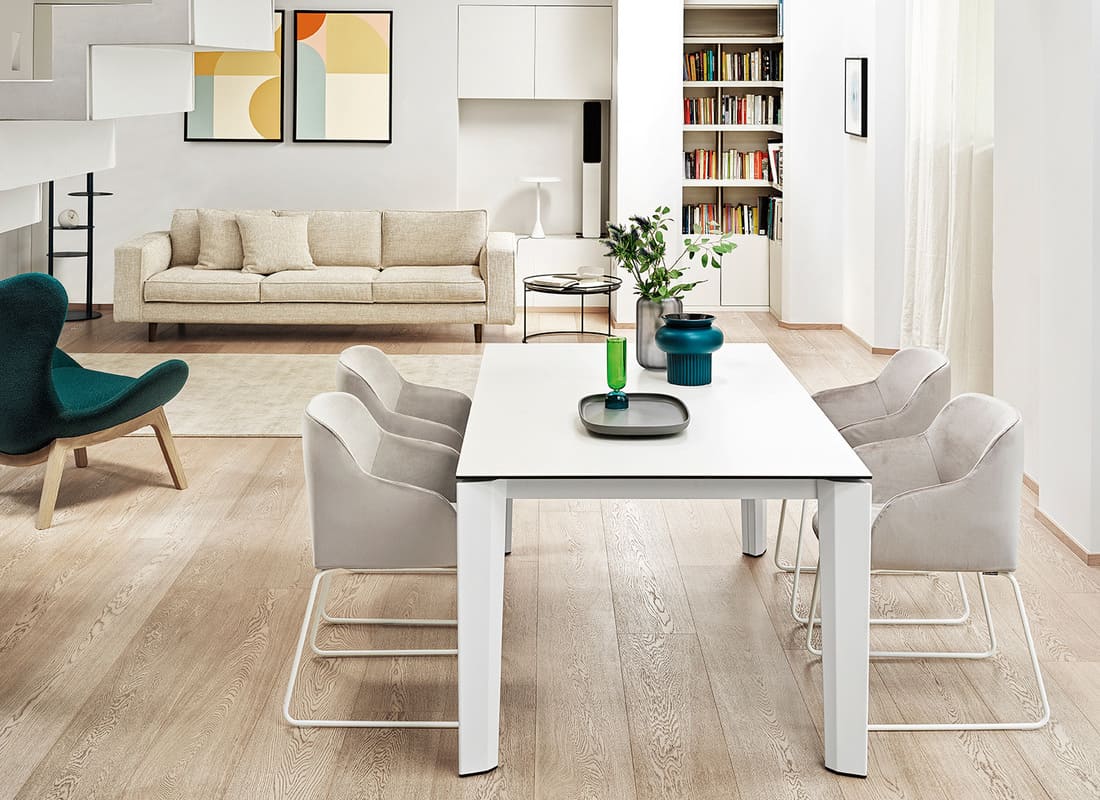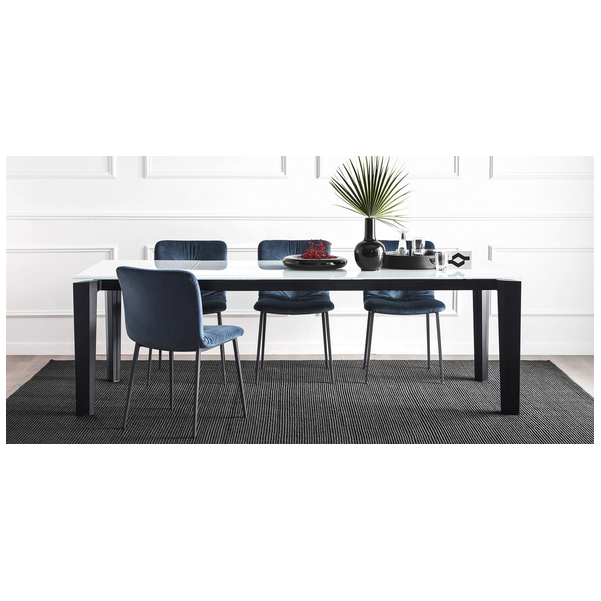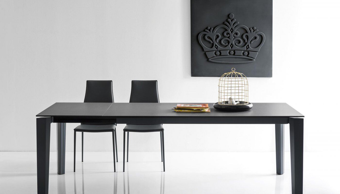 Stół rozkładany Delta z metalowymi nogami. Stół Delta ma ukośne nogi i blat, który rozciąga się wzdłuż prowadnic. Nogi zawsze pozostają w rogach stołu, zapewniając maksymalny komfort wszystkim gościom.