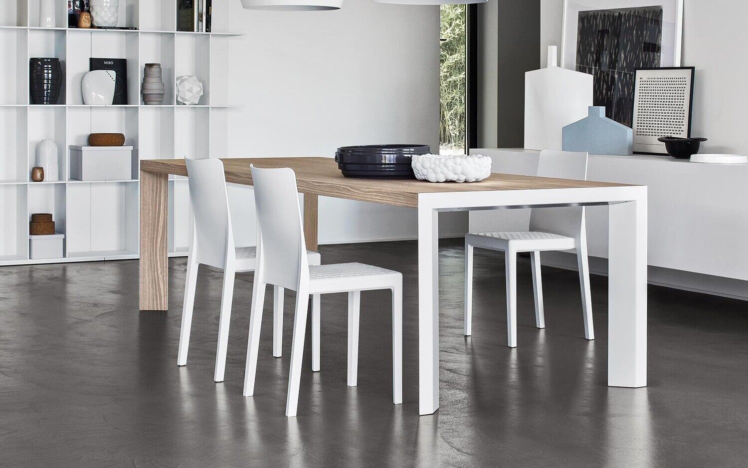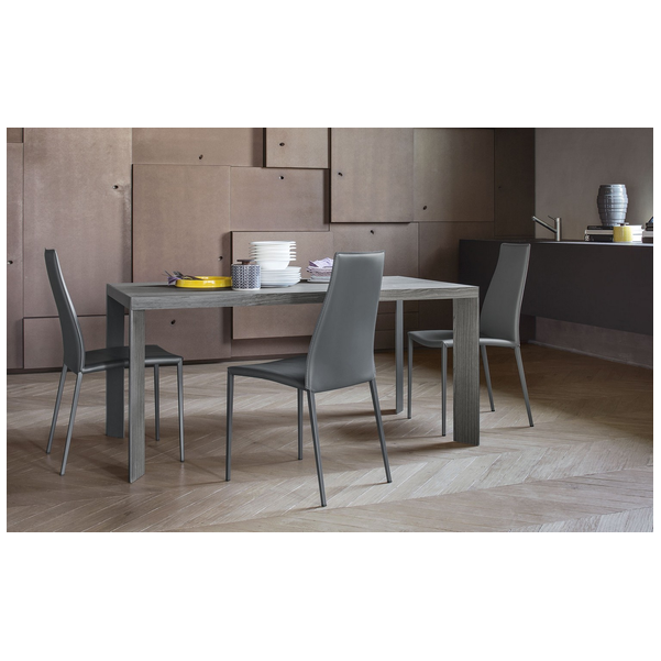 Stół posiada doskonale zintegrowany system ukryty w ramie: nogi przesuwają się na jedną stronę, co pozwala na umieszczenie na miejscu nadstawki w kolorze blatu. W ten sposób nogi zawsze pozostają w rogach, a ich walory estetyczne, wynikające z ukośnego ułożenia i powlekanego profilu metalowego, są podkreślone. Lam oferuje niezliczone możliwości kombinacji zarówno w środowisku domowym, jak i roboczym. Wybierz go, aby dodać charakteru do jadalni lub gabinetu.