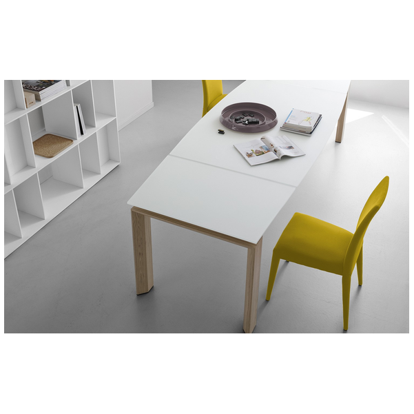 Stół z prostokątnym rozkładanym szklanym blatem i drewnianymi nogami. Moving z blatem w kształcie cygara: prostokątny z zaokrąglonymi długimi bokami. Bardzo długi stół rozkładany. Zastosowanie najnowocześniejszej technologii - opatentowanego teleskopowego mechanizmu wysuwanego skrzydła - pozwoliło nam stworzyć super rozkładany stół, którego długość można podwoić jednym, praktycznym ruchem. Naciskając uchwyty na krótkim końcu i pociągając do siebie, listwy przedłużające wysuwają się kolejno spod blatu i ustawiają się automatycznie. Nogi wykończone drewnem lub metalem pozostają na rogach, zapewniając tym samym najwyższy komfort wszystkim gościom. Różnorodność materiałów i wykończeń dostępnych dla stołu Moving pozwala na różnorodne kombinacje, aby zaspokoić wszelkie potrzeby wyposażenia.