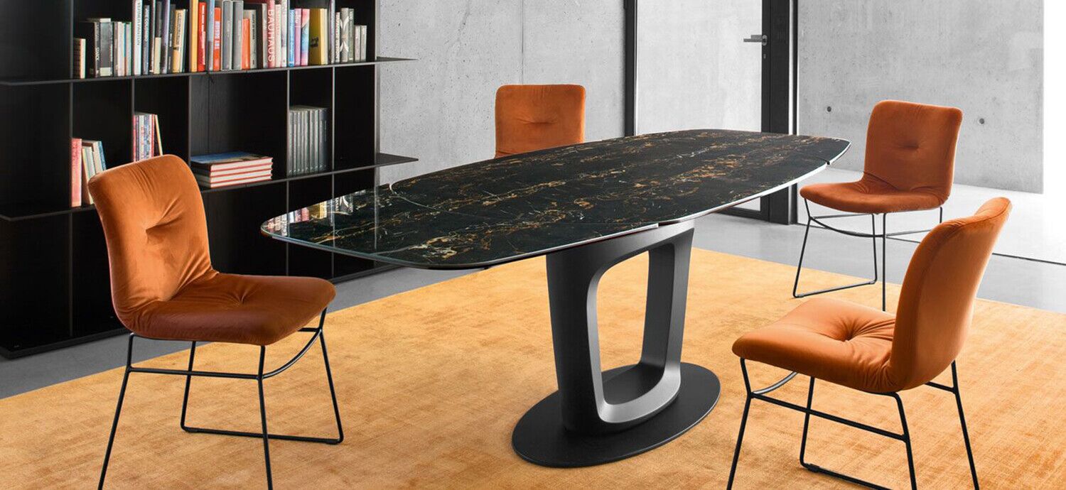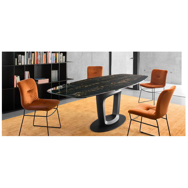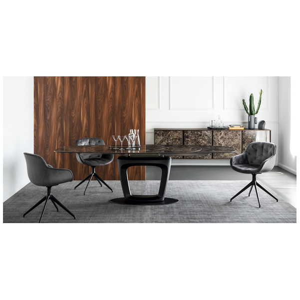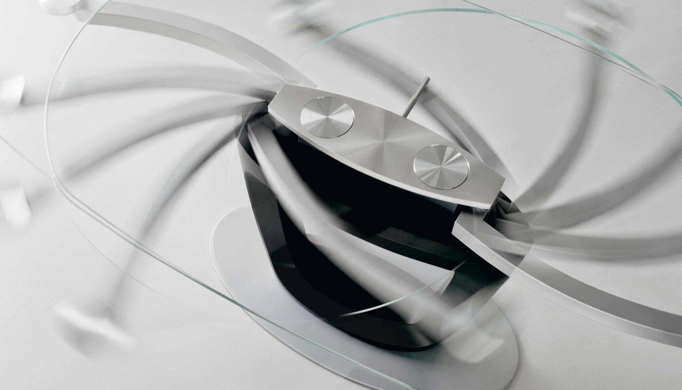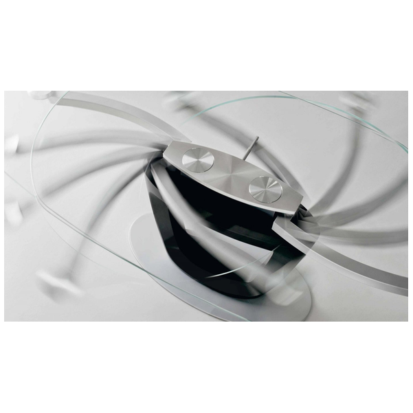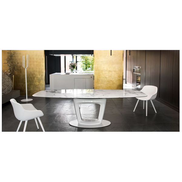 Stół rozkładany Orbital, podstawa i eliptyczny blat. Pininfarina Design. Stół Orbital posiada zaawansowany technologicznie system automatycznego rozkładania. Dzięki jednemu płynnemu ruchowi metalowych ramion, dwa wysuwane blaty wysuwają się spod ceramicznego blatu i jednocześnie ustawiają się na tym samym poziomie, zachowując eliptyczny kształt stołu. Urządzenie blokujące zapobiega przypadkowemu zamknięciu. Podstawa cokołu ze sztywnego poliuretanu z dużym centralnym otworem i metalowa płyta nośna zapewniają stabilność ramy. Orbital to zaawansowany technologicznie stół rozkładany o przemyślanym designie, stanowiący malowniczą obecność w Twoim domowym zestawie, prawdziwy bohater Twojej jadalni.