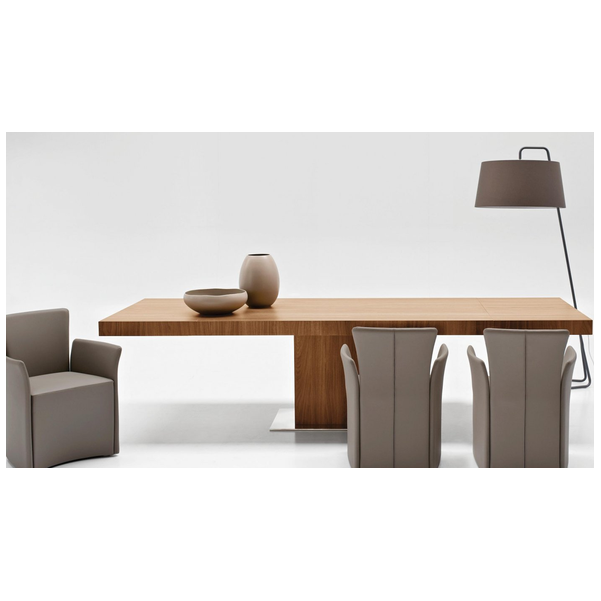 Park to wyjątkowo długi rozkładany stół z szerokim prostokątnym blatem, który spoczywa na solidnej drewnianej podstawie z chromowaną blachą. Dwa boczne skrzydła przedłużające można zdejmować pojedynczo, wystarczy pociągnąć do siebie, aby wsunąć je od spodu blatu i wyrównać prostym ruchem. Park to efektowny wizualnie stół rozkładany, idealny do wyposażenia przestronnej jadalni z elegancją, może wygodnie pomieścić do 12 osób.