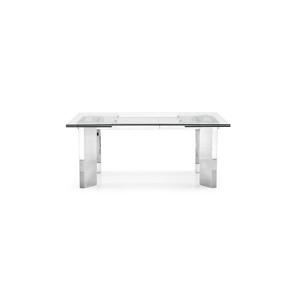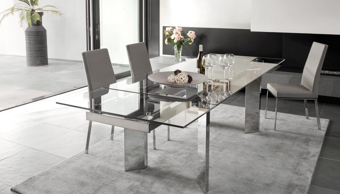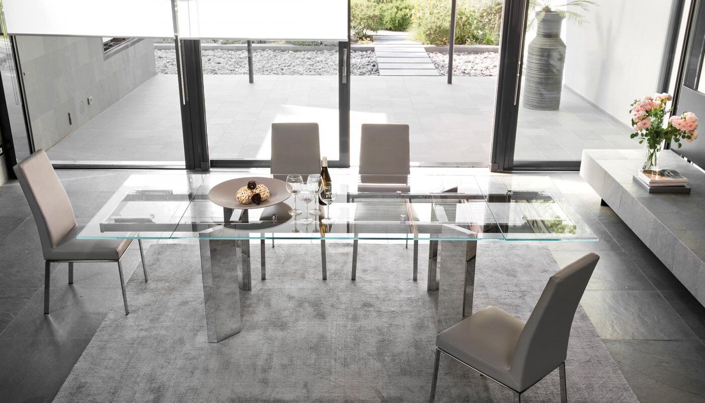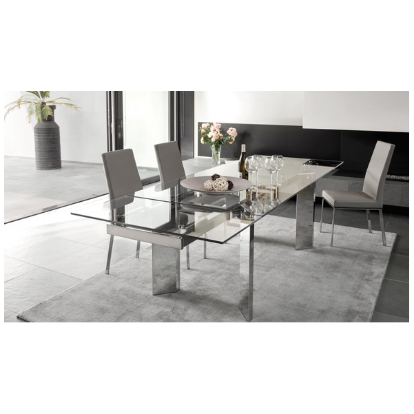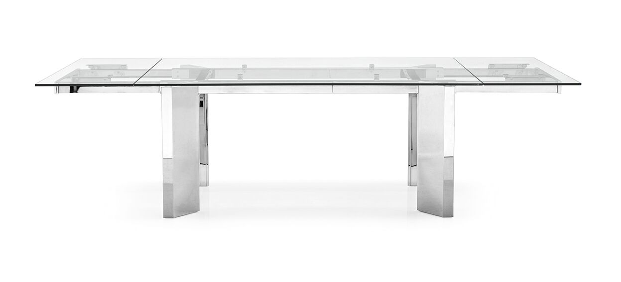 Stół rozkładany Tower ma drewniano-metalową ramę z prostokątnym blatem szklanym lub szklano-ceramicznym. Dwa boczne przedłużenia można wyciągać pojedynczo, wystarczy pociągnąć je do siebie, aby wysunąć je spod blatu i wyrównać jednym prostym ruchem. Po rozłożeniu wygodnie pomieści do 10 osób.