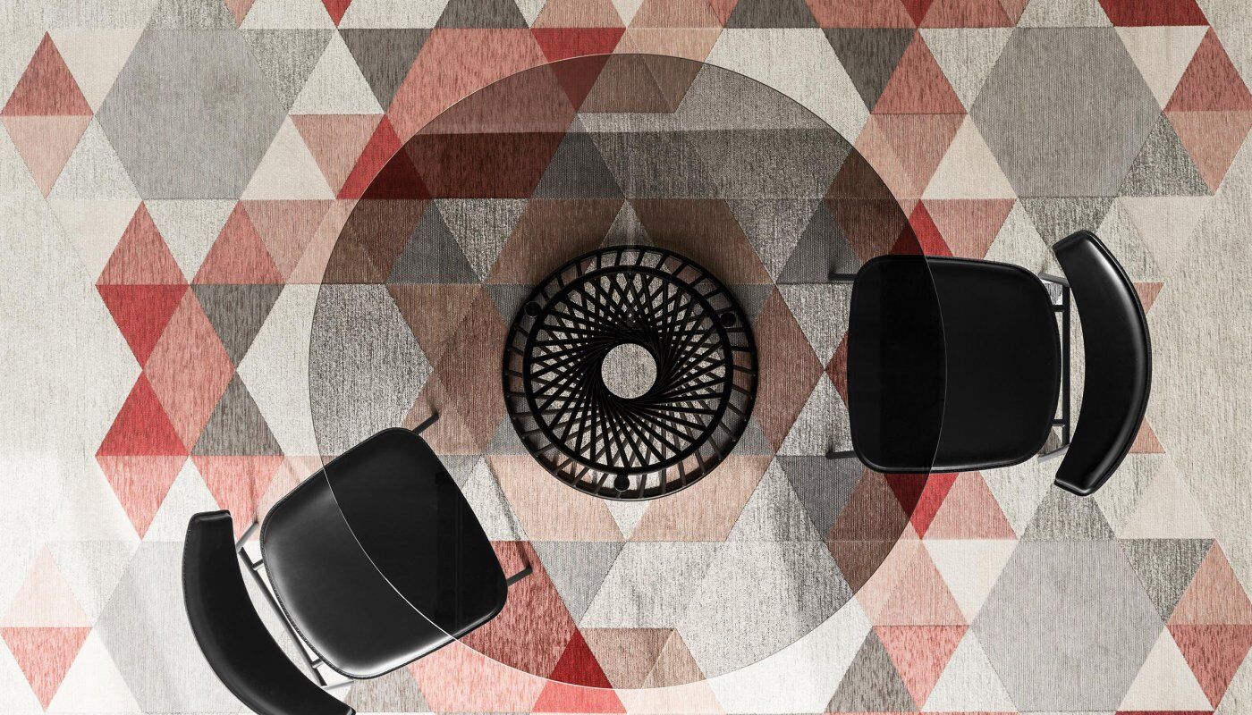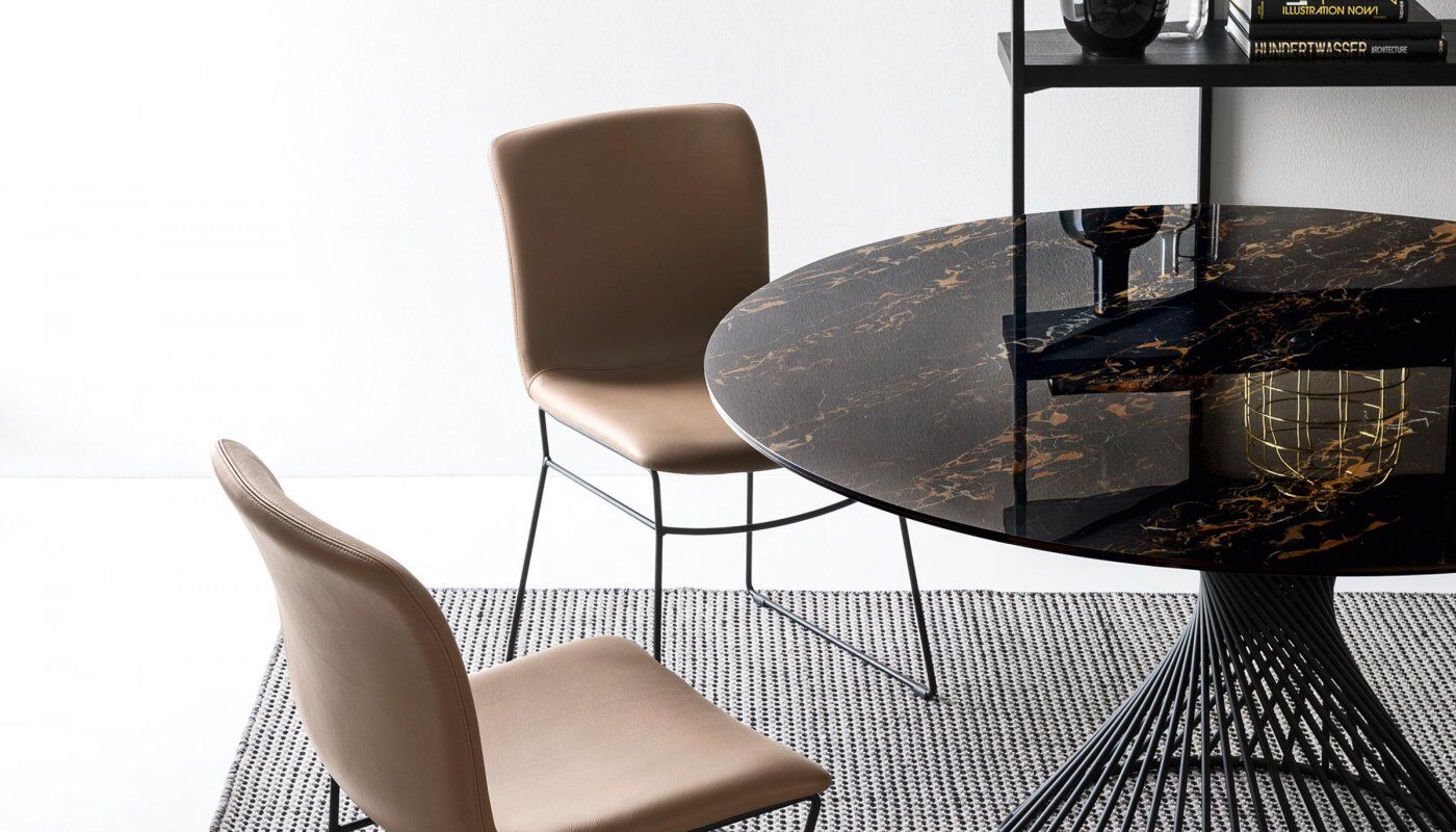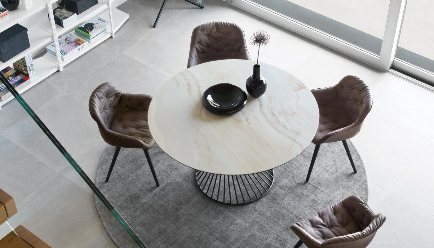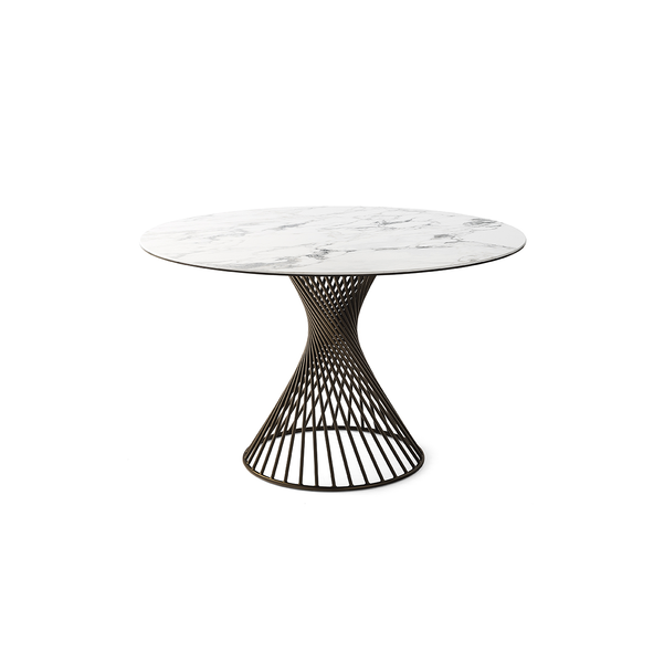 Okrągły stół Vortex tworzy silne poczucie przynależności między ludźmi, wspomagając rozmowę po prostu swoim kształtem. Wrażenie to jest podkreślone przez Vortex dzięki dekoracyjnej i funkcjonalnej centralnej podstawie, która dzięki spiralnej ramie z metalowej rury nadaje stołowi osobisty charakter. Szklany lub szklano-ceramiczny blat doskonale komponuje się z metalową podstawą i jest przymocowany do ramy za pomocą trzech okrągłych stalowych płyt.
