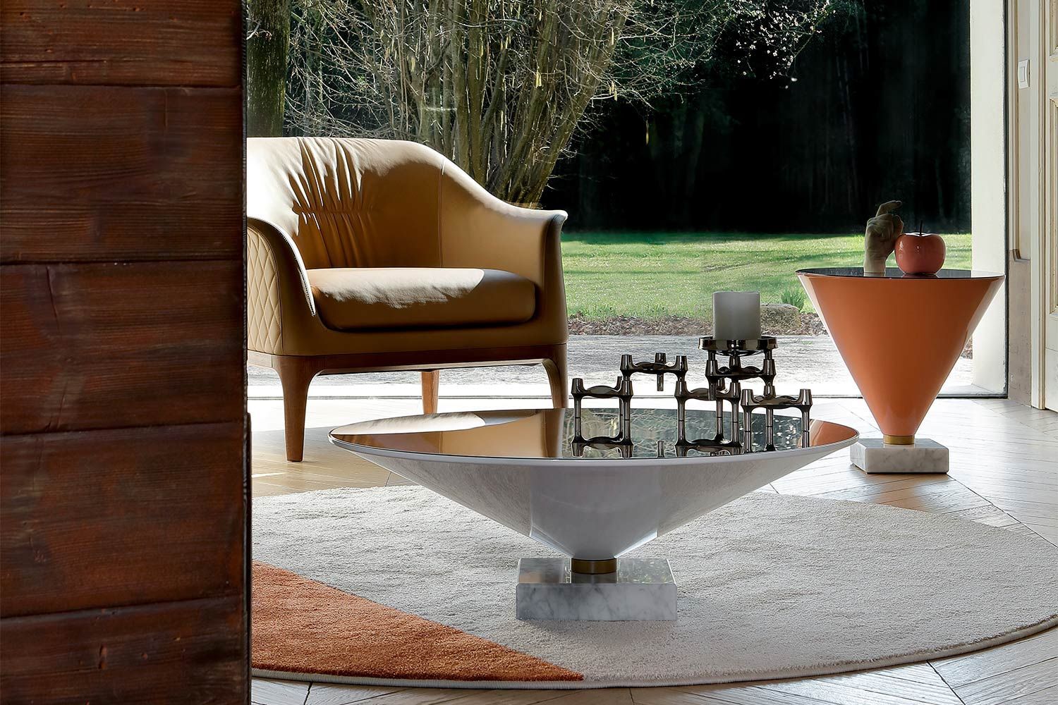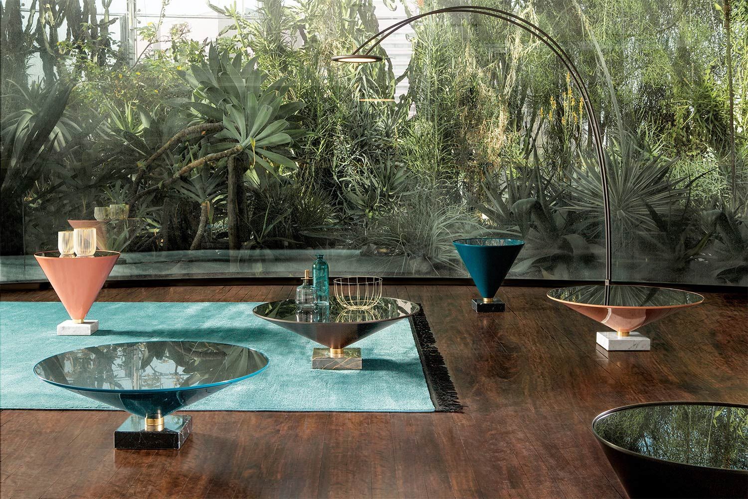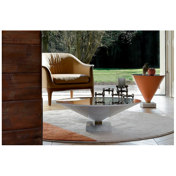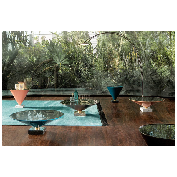 Stolik kawowy Flute to jedyna w swoim rodzaju propozycja do współczesnego salonu. Inspirowany geometrią stół ma trójkątny profil, który przechodzi od wąskiego do grubego, aby stworzyć dużo miejsca na górze, i pięknie balansuje na kwadratowej podstawie. Choć wygląda delikatnie, stół jest wykonany tylko z najlepszych materiałów i ma służyć przez długi czas. Kontrast między szklanym blatem, a marmurowymi bokami stanowi element dopełniający. Blat jest wykonany z wędzonego szkła, a rama jest dostępna w różnych opcjach marmuru, a akcent pierścienia jest w kolorze złotym.