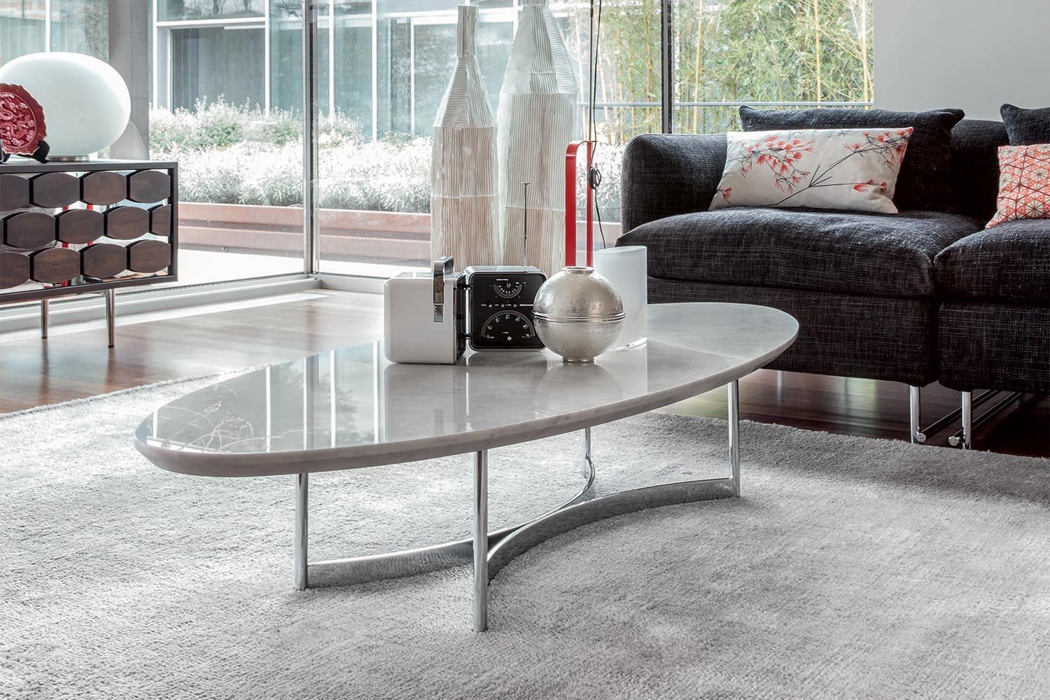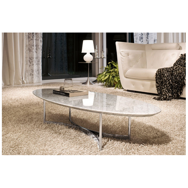 Stolik kawowy Parioli, przypominający deskę surfingową, wyróżnia się w nowoczesnym salonie. Dwustronna metalowa podstawa wygina się do wewnątrz po obu stronach, co przyciąga wzrok. Dzięki dużej ilości miejsca na górze jest wiele możliwości dekoracyjnych, a także miejsce na napoje, przekąski i piloty. Dostępne są dwa rozmiary, blat ma różne wykończenia marmuru. Podstawa ma różne metalowe wykończenia.