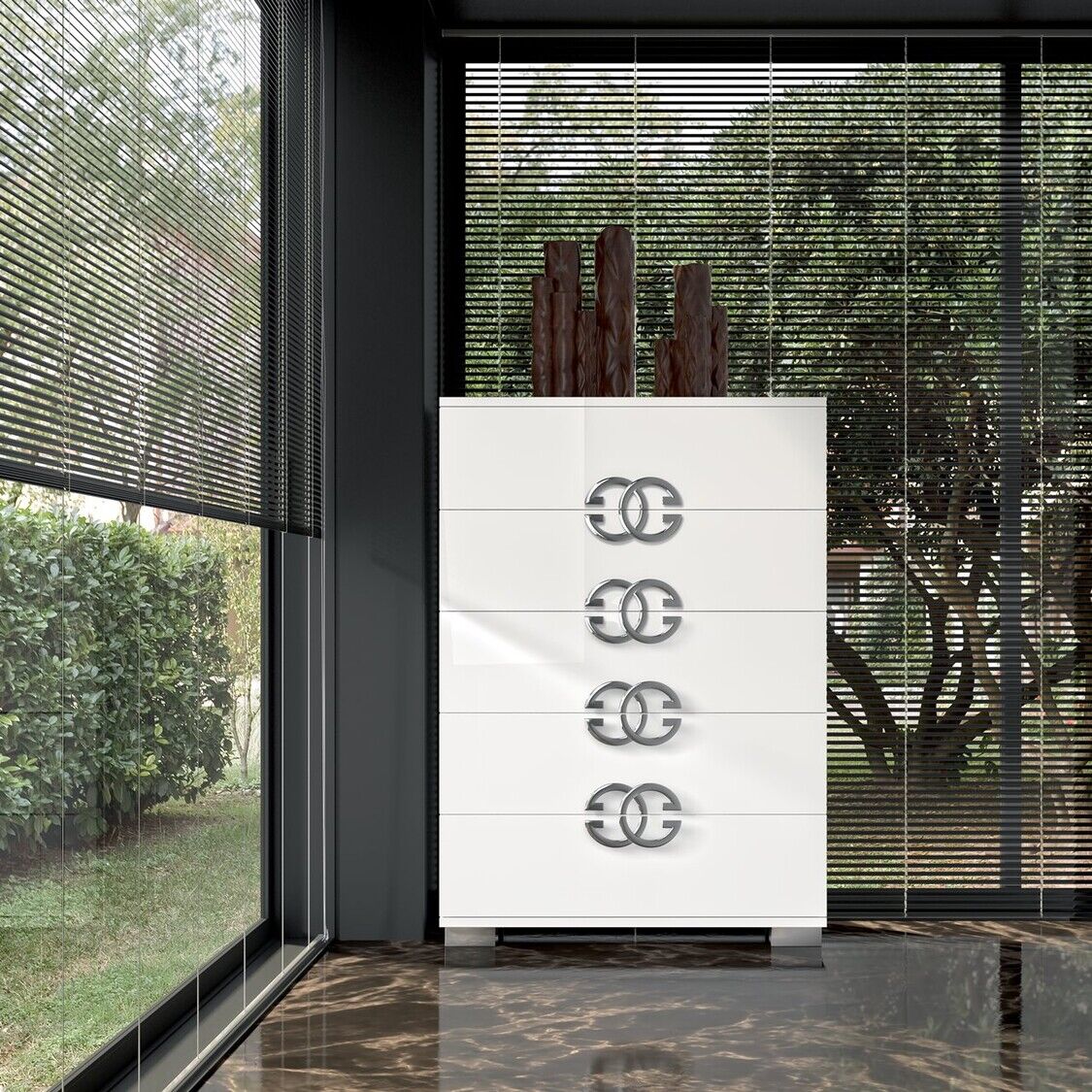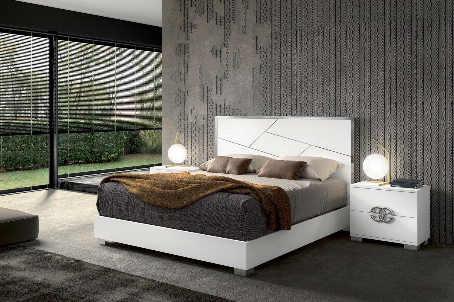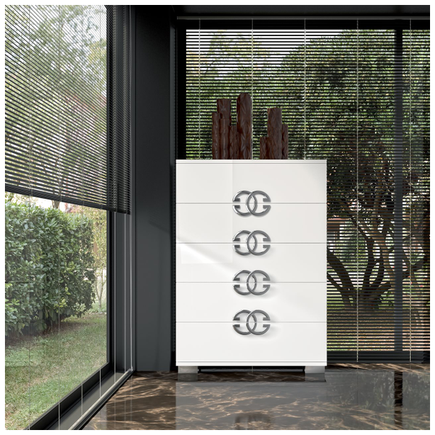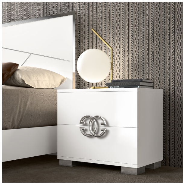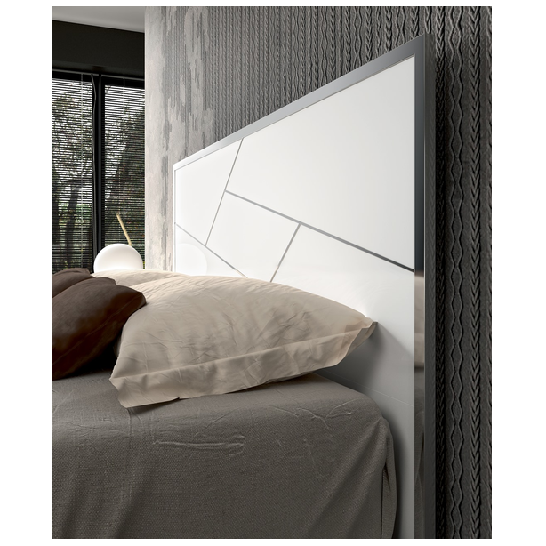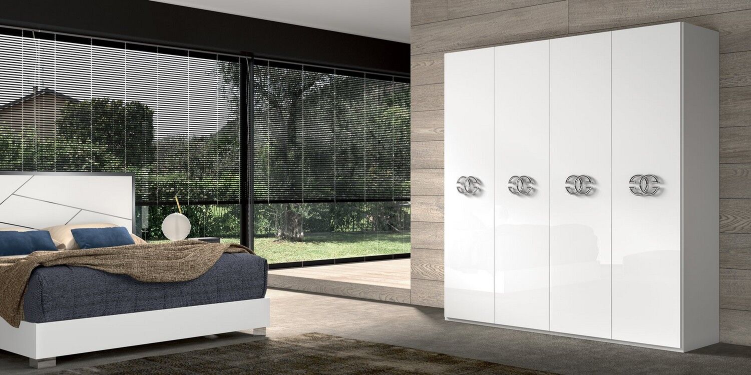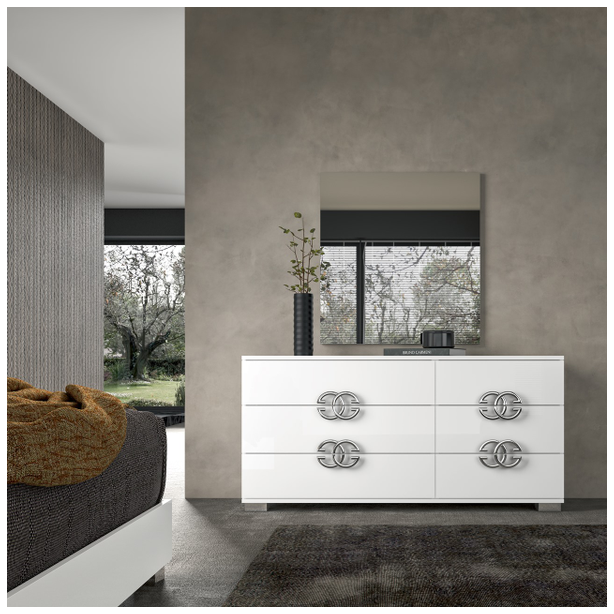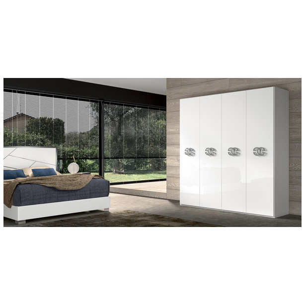 Włoska sypialnia Dafne charakteryzująca się pięknem designu, prostotą formy i zachwycającymi wykończeniami. W kolekcji znajduje się podwójne łóżko z szerokimi ramami, niskimi metalowymi nogami i drewnianymi zagłówkami ze stalowym dekorem. Zestaw uzupełniają także szafki nocne, komody, szafy i lustra. Materiałem do produkcji jest płyta MDF pokryta ekologicznymi błyszczącymi białymi lakierami, których nakładanie odbywa się w kilku etapach. Ponadto zestaw zdobią chromowane elementy ze stali, efektowne uchwyty, lustra, a wysokiej jakości wyposażenie wnętrza daje właścicielowi maksymalny komfort.