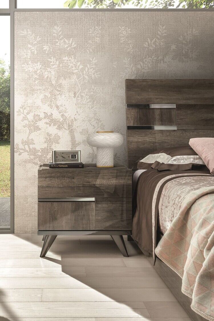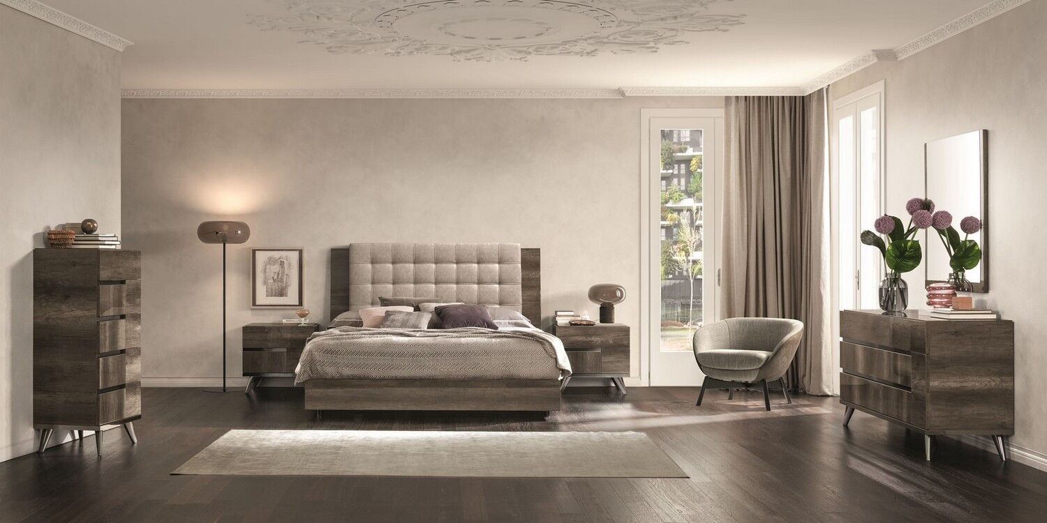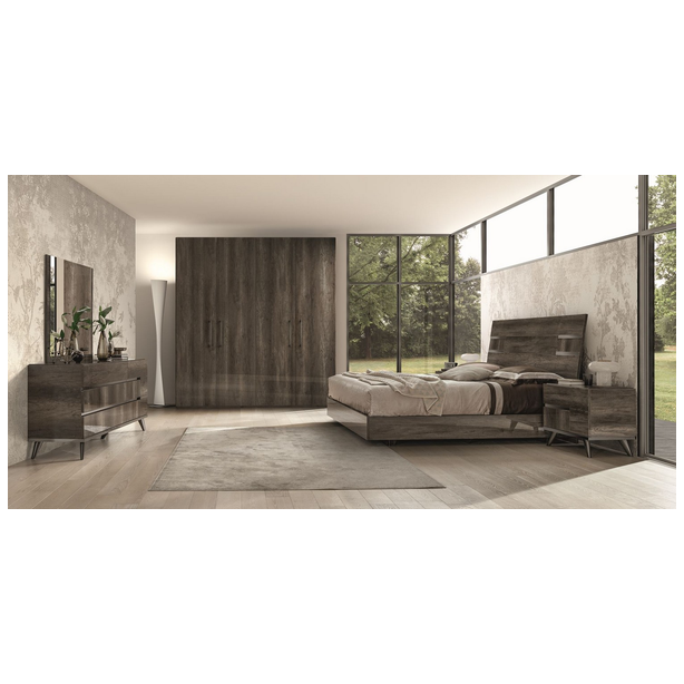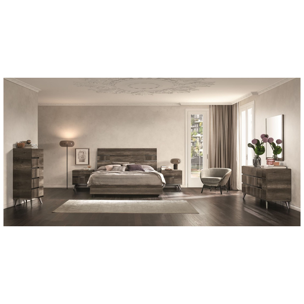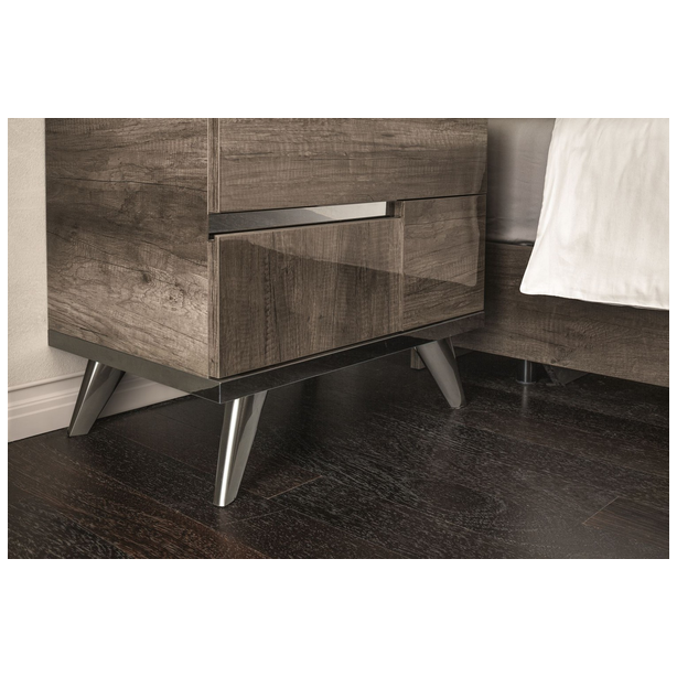 Nowoczesna sypialnia Medea to elegancka kolekcja zawierająca niezbędne atrybuty wnętrza, które pozwolą na zwięzłe i stylowe zaaranżowanie przestrzeni. Znajdują się tu łóżko z drewnianym wezgłowiemi, szafki nocne, komody z fazowanymi stalowymi nogami, wiszące lustra wykonane z materiału imitującego dąb, pokrytego błyszczącymi lakierami, których aplikacja odbywa się w kilku etapach. Ponadto elewacje ozdobione są stalowymi wstawkami polerowanymi i matowymi. Zagłówek łóżka może być wykonany w miękkiej, lekkiej ekoskórze.