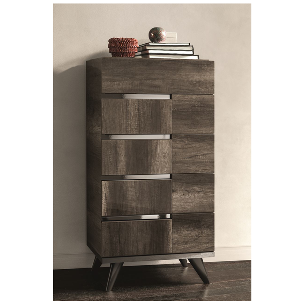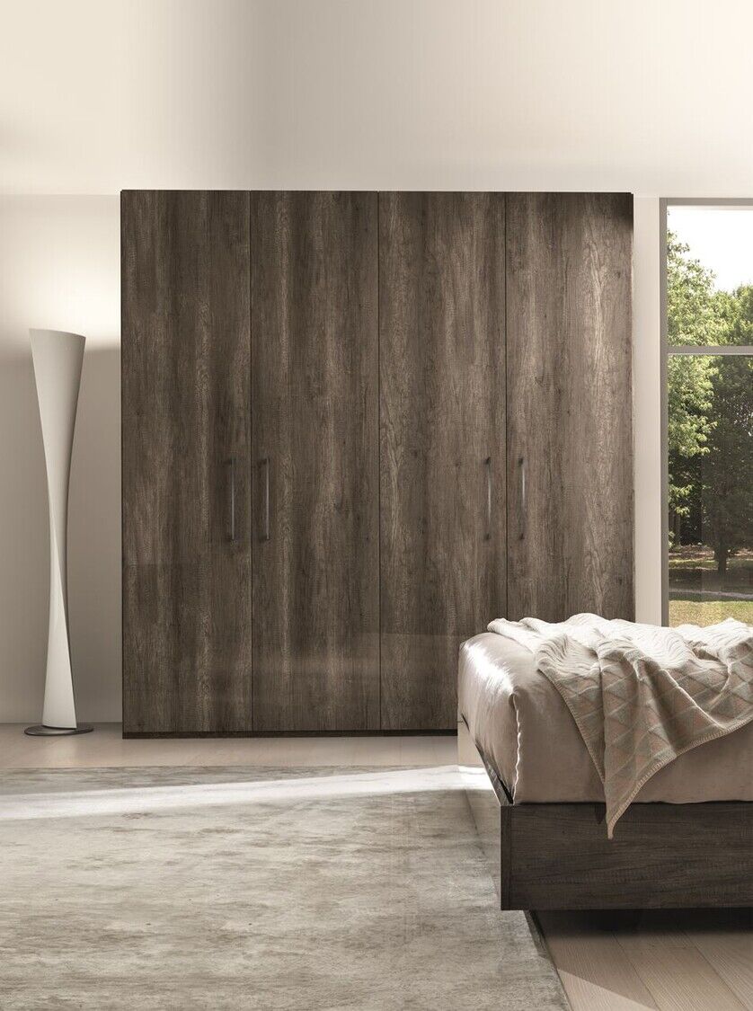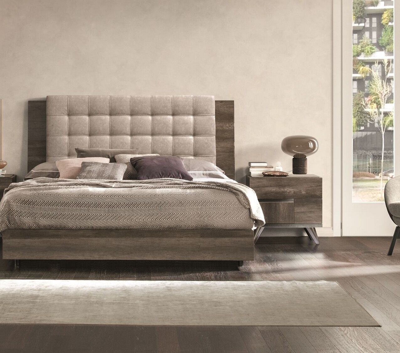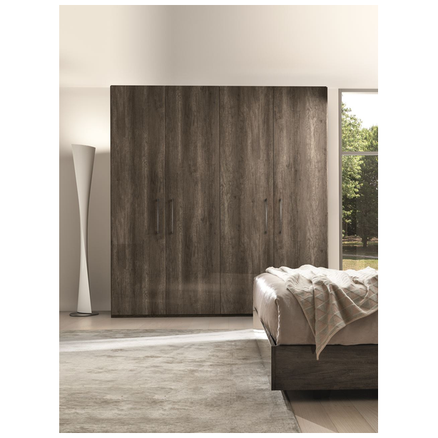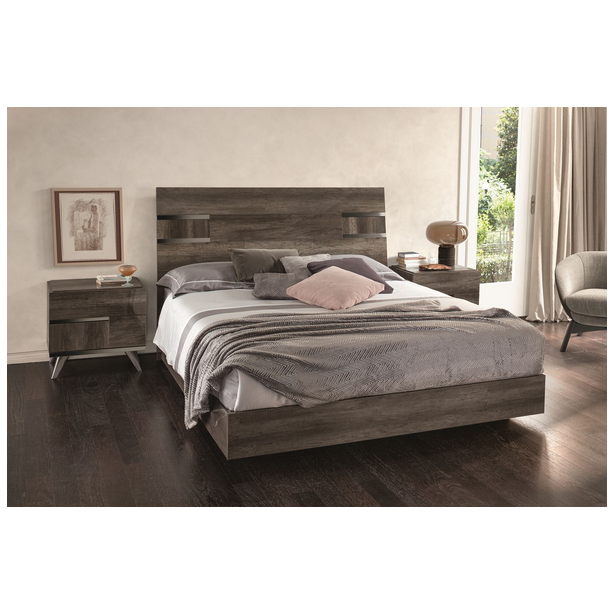 Nowoczesna sypialnia Medea to elegancka kolekcja zawierająca niezbędne atrybuty wnętrza, które pozwolą na zwięzłe i stylowe zaaranżowanie przestrzeni. Znajdują się tu łóżko z drewnianym wezgłowiemi, szafki nocne, komody z fazowanymi stalowymi nogami, wiszące lustra wykonane z materiału imitującego dąb, pokrytego błyszczącymi lakierami, których aplikacja odbywa się w kilku etapach. Ponadto elewacje ozdobione są stalowymi wstawkami polerowanymi i matowymi. Zagłówek łóżka może być wykonany w miękkiej, lekkiej ekoskórze.