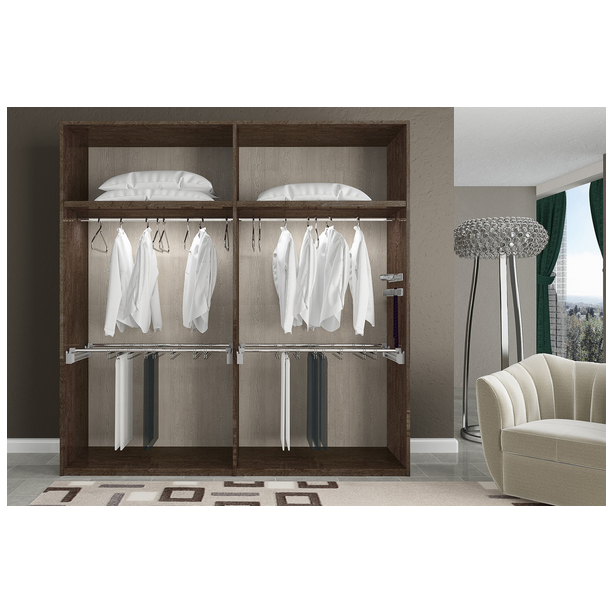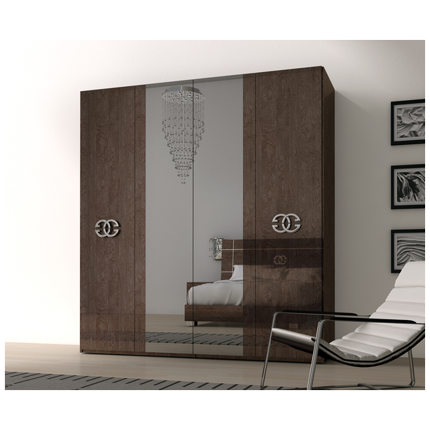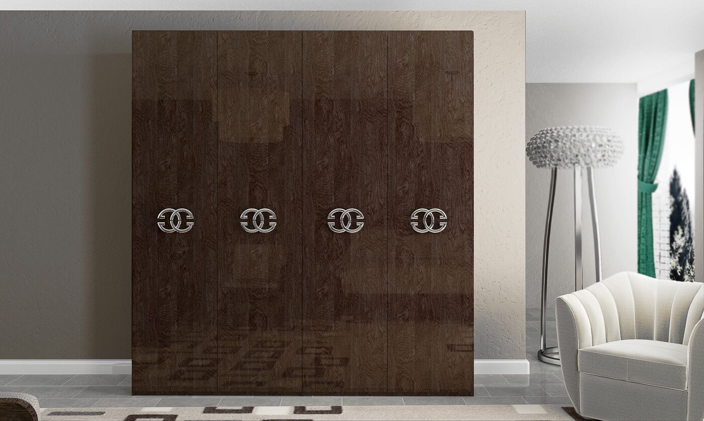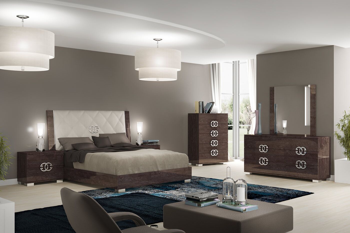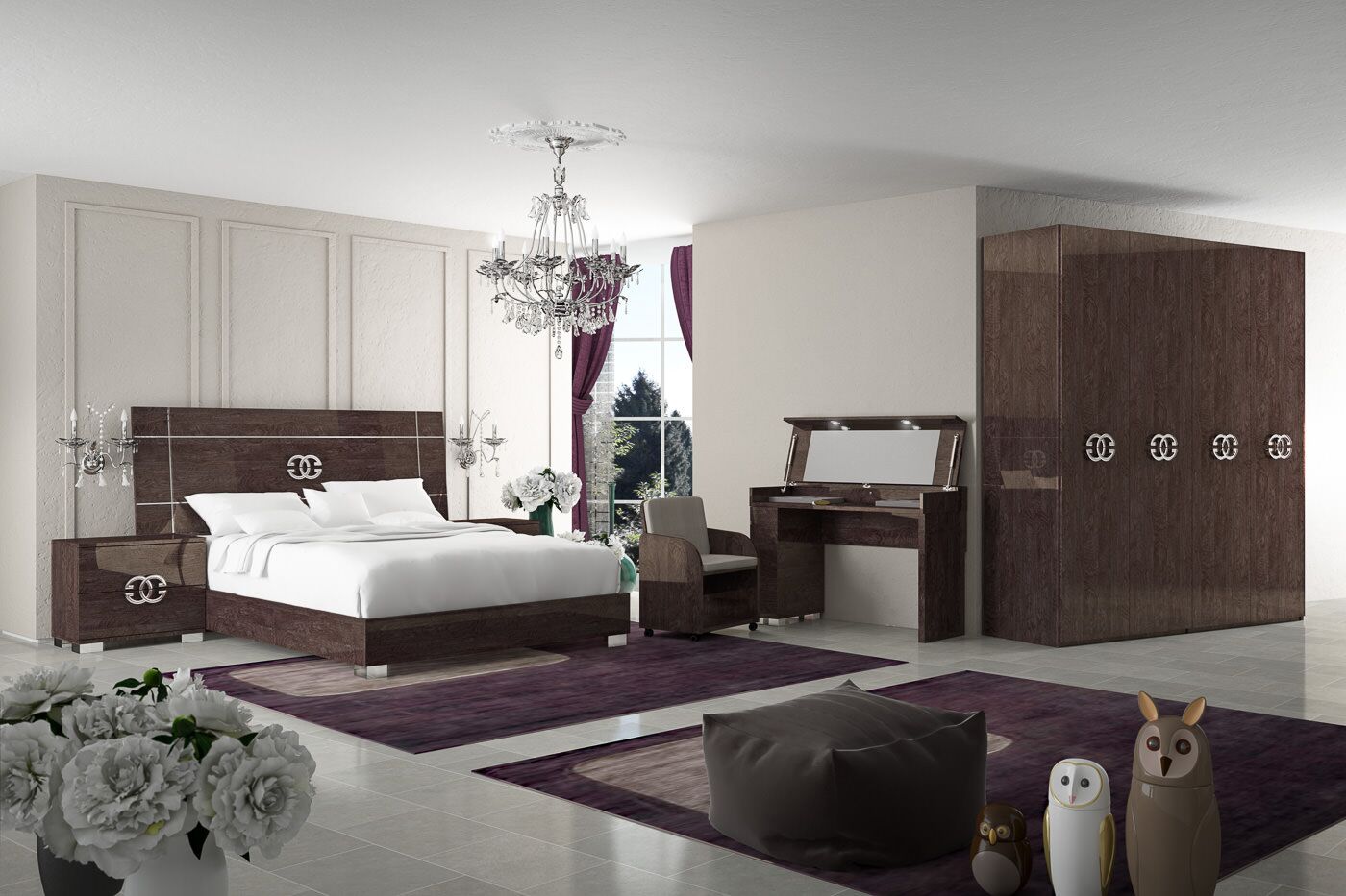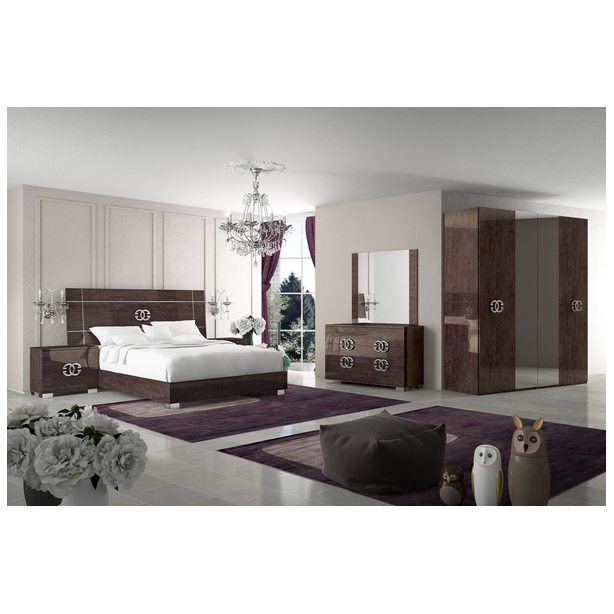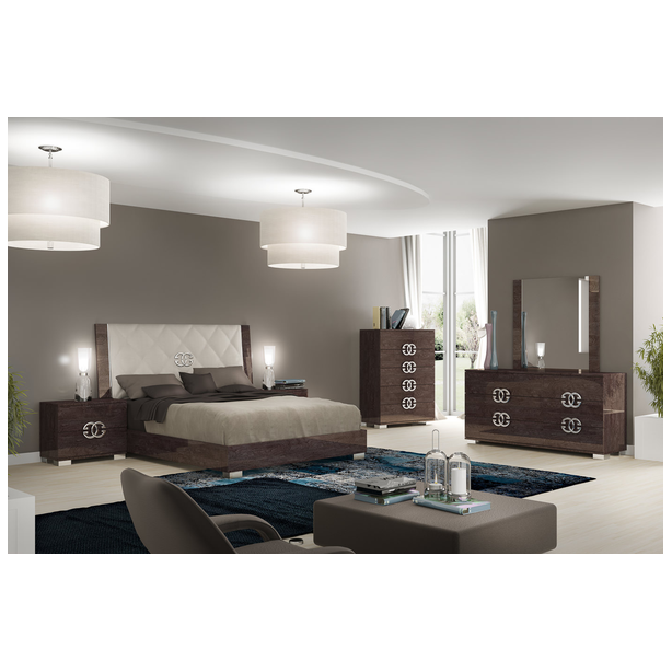 Włoska sypialnia Prestige to stylowa kolekcja, która wypełni wnętrza atmosferą wyjątkowego szyku i harmonii. W kolekcji znajdują się podwójne łóżko na solidnych stelażach, niskich metalowych nogach, z zagłówkami, obszyte miękką tapicerką i stalowym dekorem. Zestaw uzupełniają także szafki nocne, komody, szafy, toaletka, fotele i lustra. Wykończenie mebli brzozowe pokryte ekologicznymi lakierami błyszczącymi z aplikacją w kilku etapach. Na tapicerkę i zagłówek wybrano beżową ekoskórę z przeszyciami. Efektowne uchwyty i dekor wezgłowia - chrom polerowany, podkreślający wyjątkowość zestawu.
