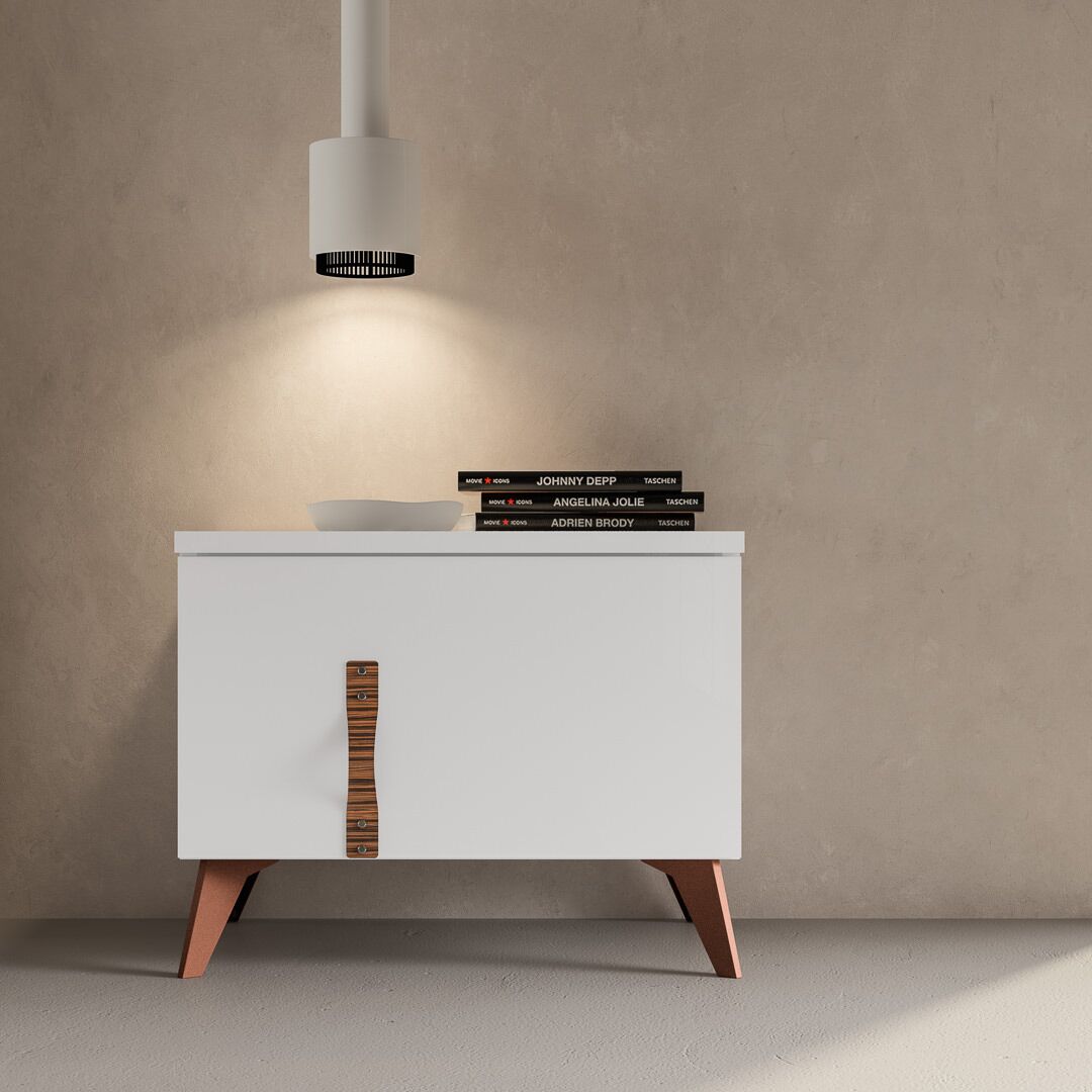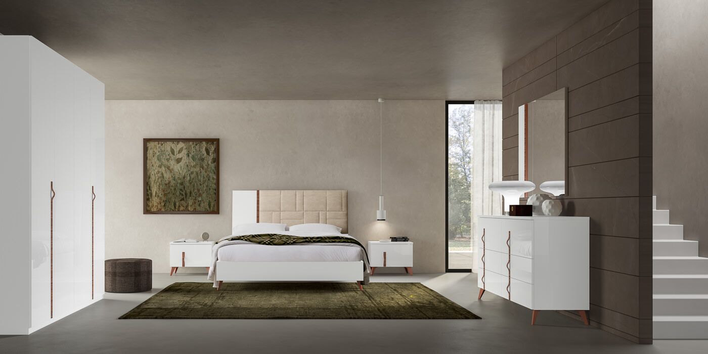 Wyrafinowanie i dbałość o szczegóły. Stylowy, nowoczesny zestaw do sypialni Sirio, wyprodukowany we Włoszech przez Status, ma białe wykończenie na wysoki połysk, drewniane akcenty z nogami w tym samym kolorze i zagłówkiem obitym ekoskórą. Łóżko ma stelaż z drewnianych listew. Zestaw składa się z łóżka typu queen size, 2 szafki nocne, podwójna komoda i lustro.