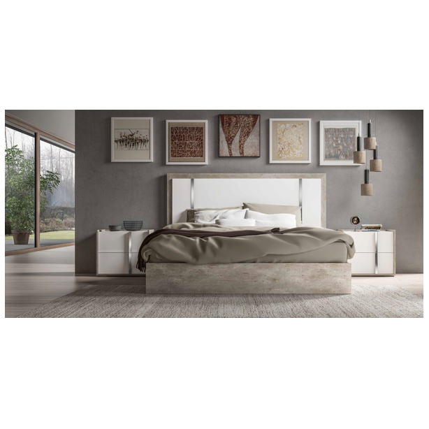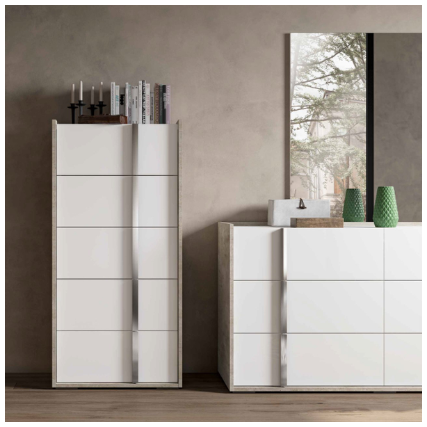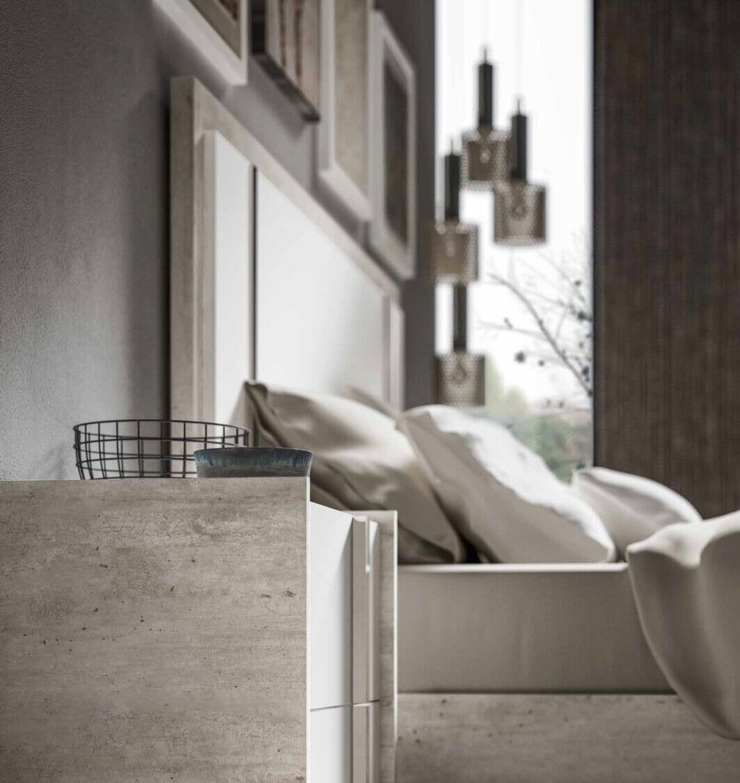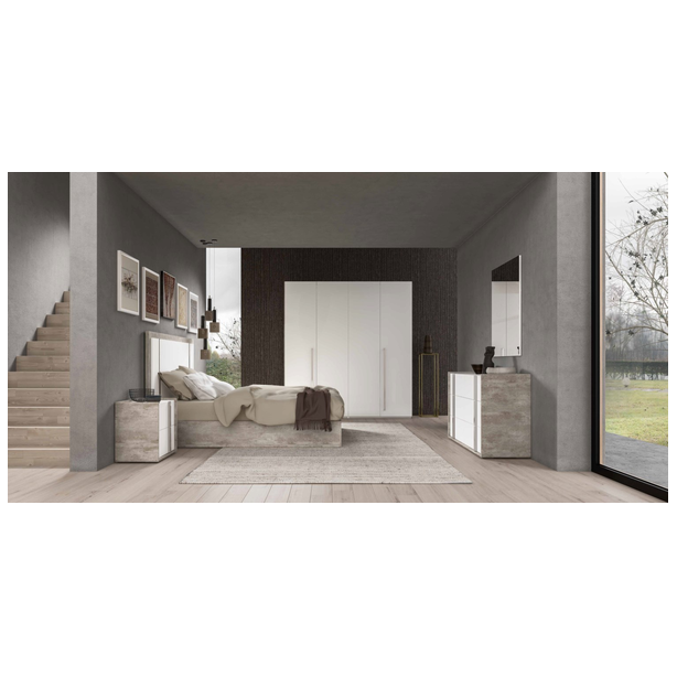 Sypialnia Treviso to nowoczesny mebel, który uosabia piękno i wszechstronność. Oryginalny dobór nowoczesnych materiałów, różnorodne techniki produkcji i wykończenia pozwalają stworzyć wykwintny zestaw. Meble prezentowane są w wykończeniu białym błyszczącym lakierem z aplikacją kilkuetapową, laminat - imitacja cementu, z elementami stalowymi w wykończeniu polerowanym chromem oraz lustrami. Takie kreatywne rozwiązanie projektowe, wieloletnie doświadczenie produkcyjne, tworzenie mebli przez pryzmat kultury włoskiej – to wszystko to meble Status 100% Made in Italy.