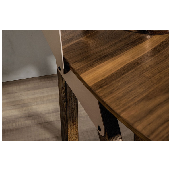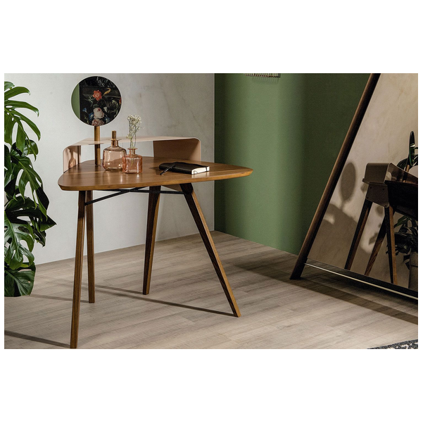 Toaletka Nipper marki Tonin Casa dodaje szyku nowoczesnej sypialni i sprawia, że przygotowanie się na cały dzień jest dziecinnie proste. Niewielki rozmiar pozwala na dopasowanie jej wszędzie i jest idealny do obszarów o ograniczonej przestrzeni. Wierzch ma dużo miejsca na produkty kosmetyczne i pielęgnacyjne i ma dwa poziomy ułatwiające organizację, posiada także opcjonalne okrągłe lusterko. Metalowa część jest wykończona w kolorze Stone Bronze, a blat i podstawa mają różne opcje z drewna do wyboru.