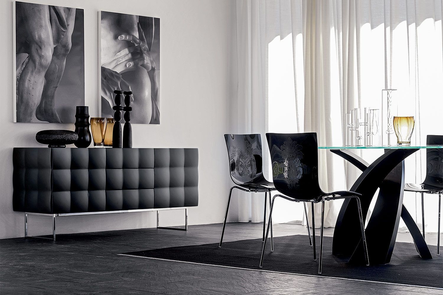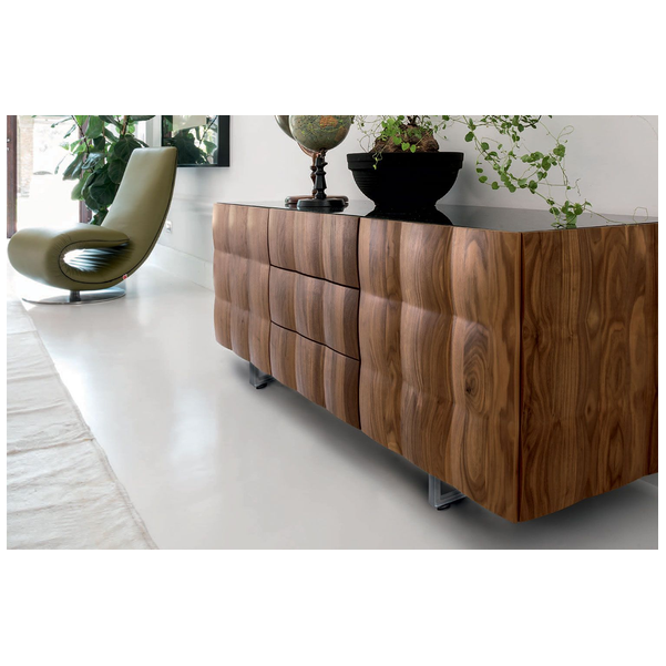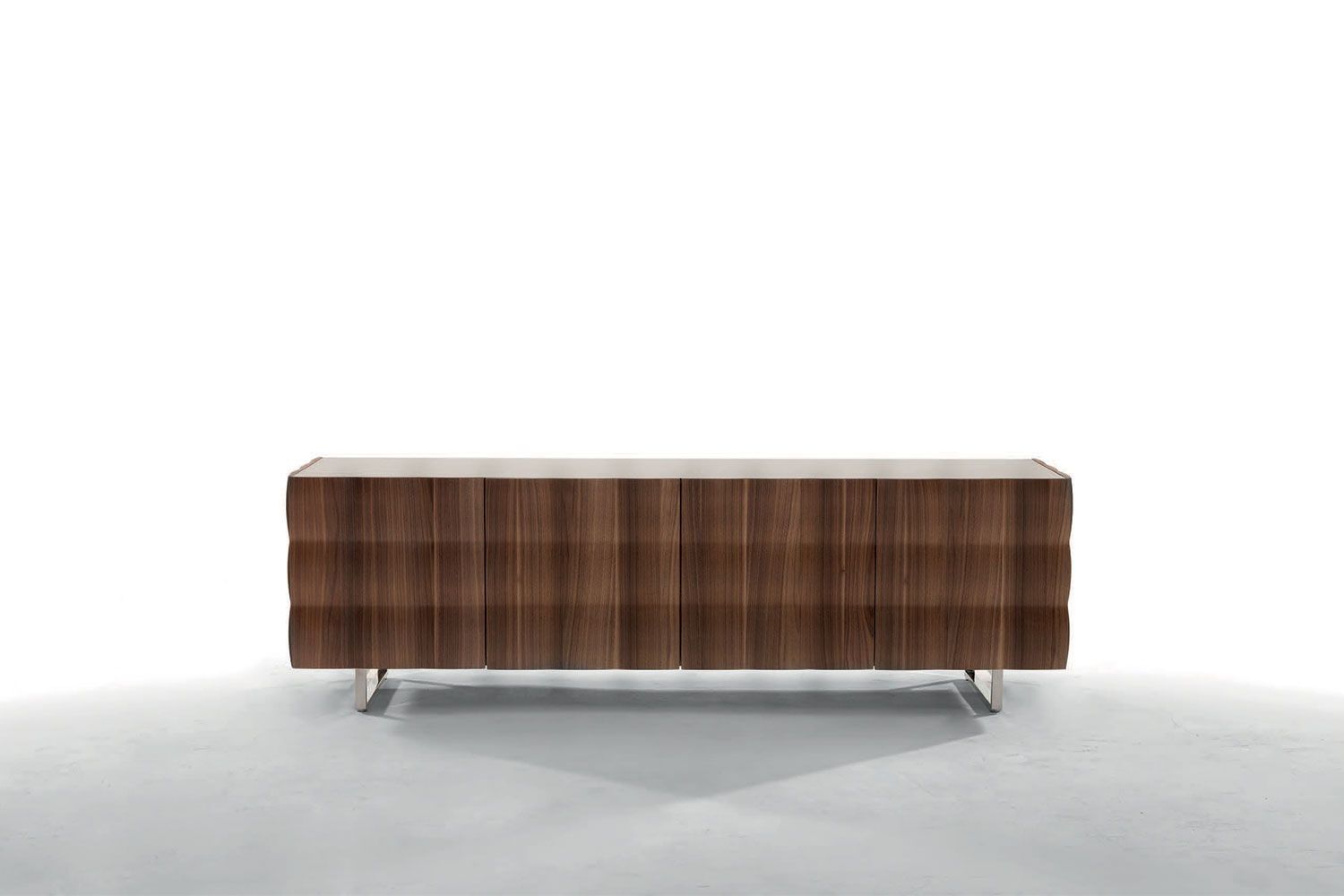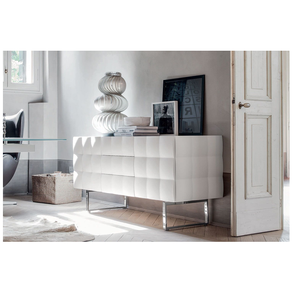 Komoda Venice jest częścią kolekcji jadalnej Venice od Tonin Casa i stanowi wyraz nowoczesnego salonu. Ma ten sam wzór w kratkę z wykończeniem z drewna orzechowego. Stojący na chromowanych metalowych nogach przyciągający wzrok Venice jest dostępny w kilku wersjach, które zaspokoją Twoje specyficzne wymagania dotyczące przestrzeni i przechowywania.