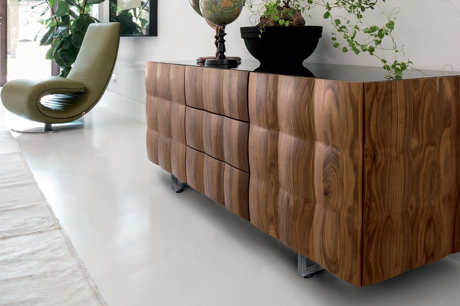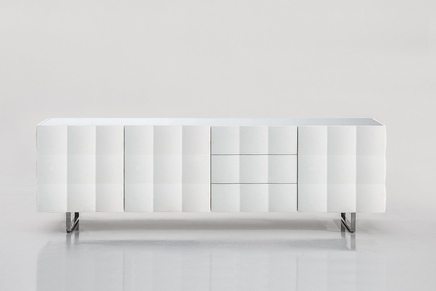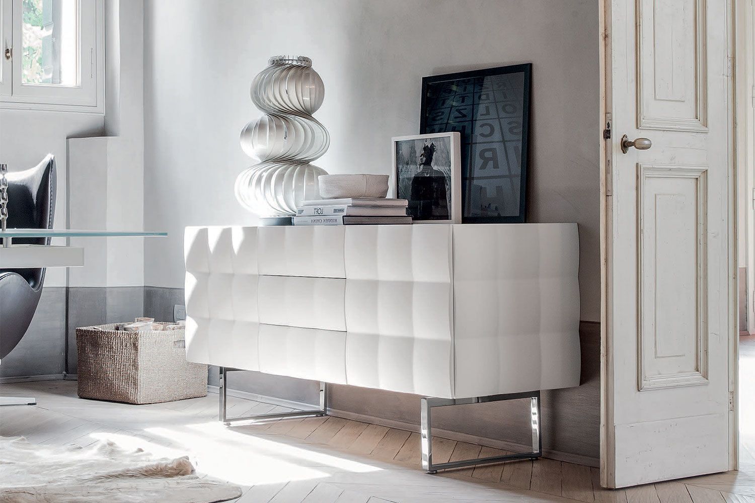 Komoda Venice jest częścią kolekcji jadalnej Venice od Tonin Casa i stanowi wyraz nowoczesnego salonu. Ma ten sam wzór w kratkę z wykończeniem z drewna orzechowego. Stojący na chromowanych metalowych nogach przyciągający wzrok Venice jest dostępny w kilku wersjach, które zaspokoją Twoje specyficzne wymagania dotyczące przestrzeni i przechowywania.